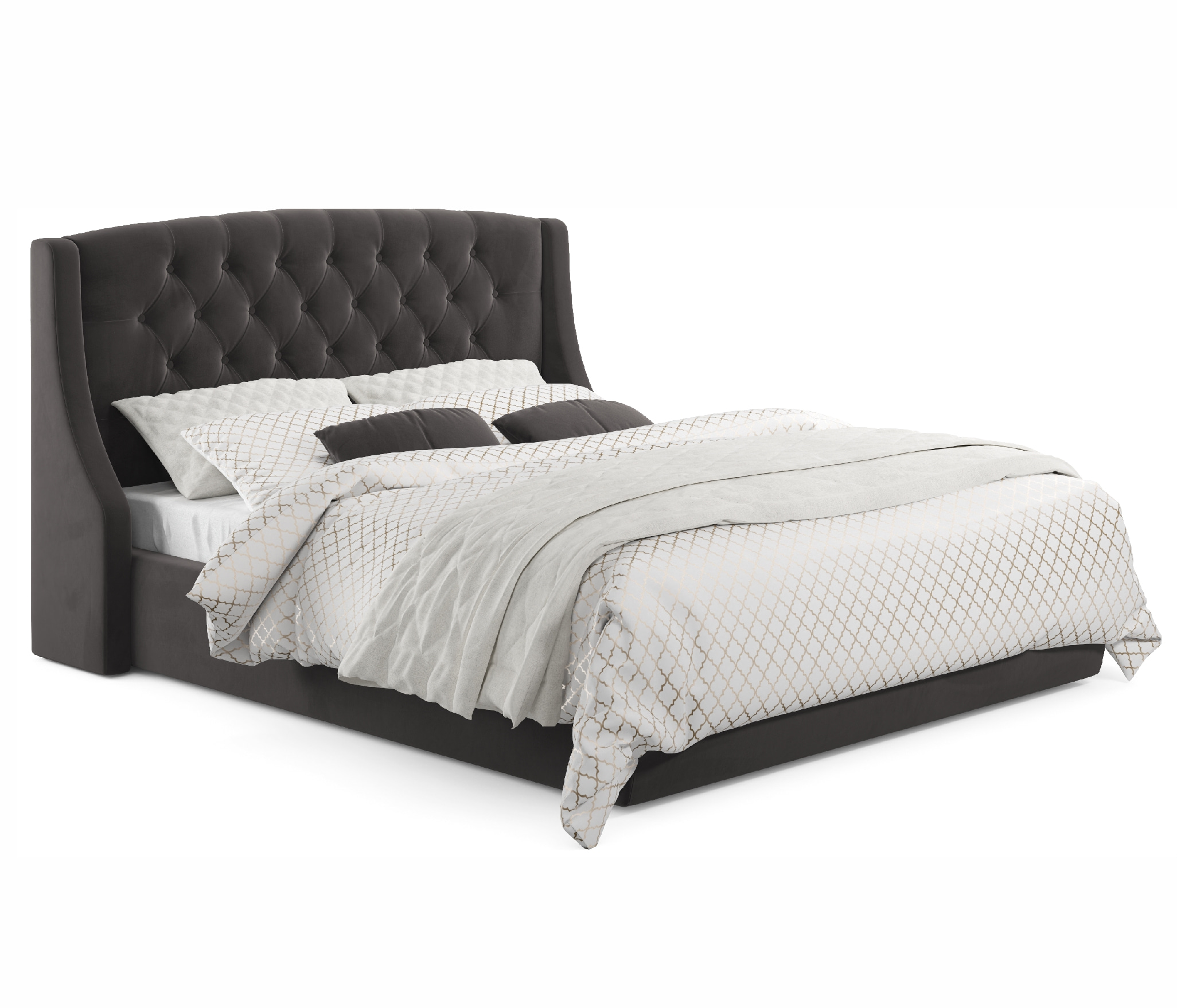 Основной акцент сделан на высоком изголовье с мягкими боковинами – “ушками”. Мягкая спинка изящно оформлены каретной стяжкой с декоративными пуговицами в тон изголовья.
