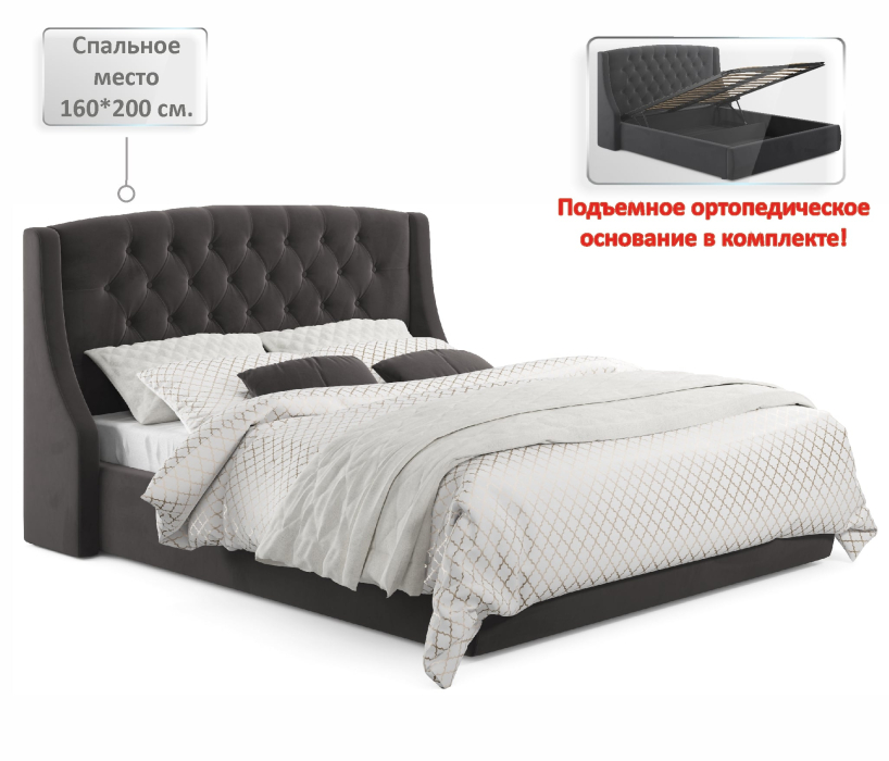 Кровать 160х200 из ткани оборудована удобным подъемным механизмом.