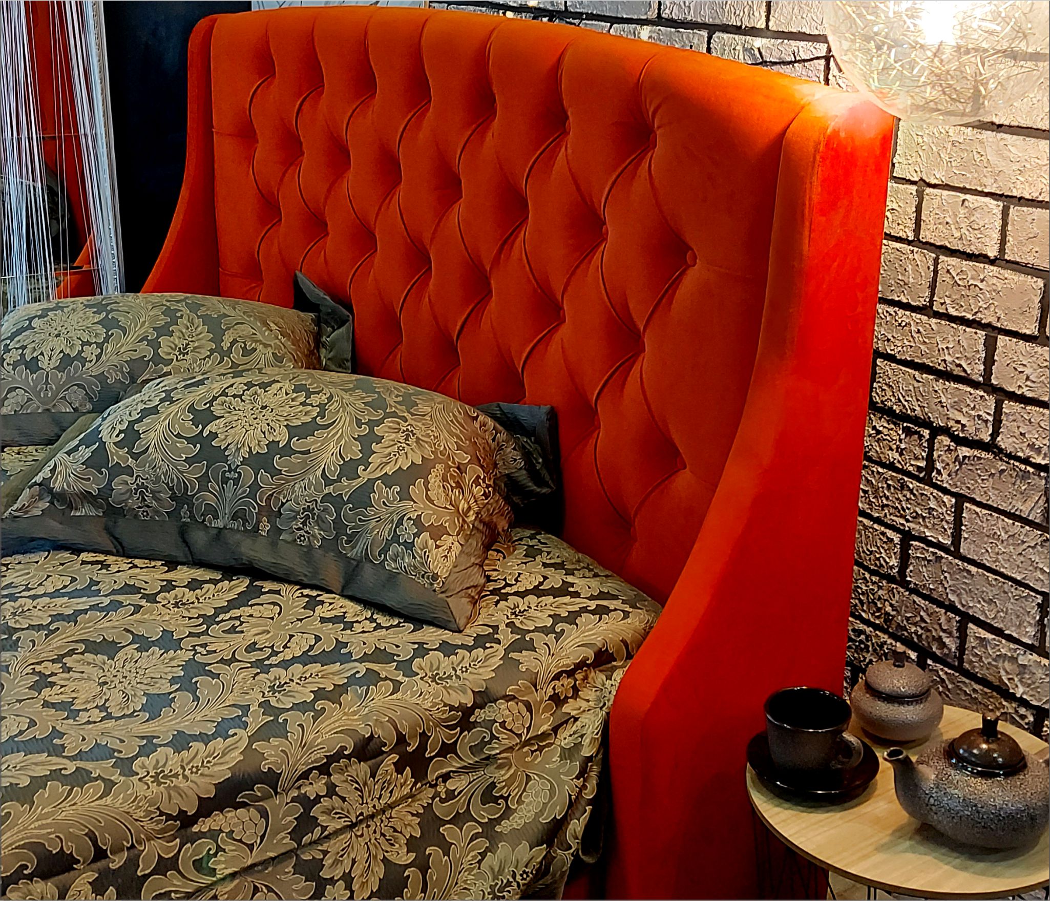 Основной акцент сделан на высоком изголовье с мягкими боковинами – “ушками”. Мягкая спинка изящно оформлены каретной стяжкой с декоративными пуговицами в тон изголовья.