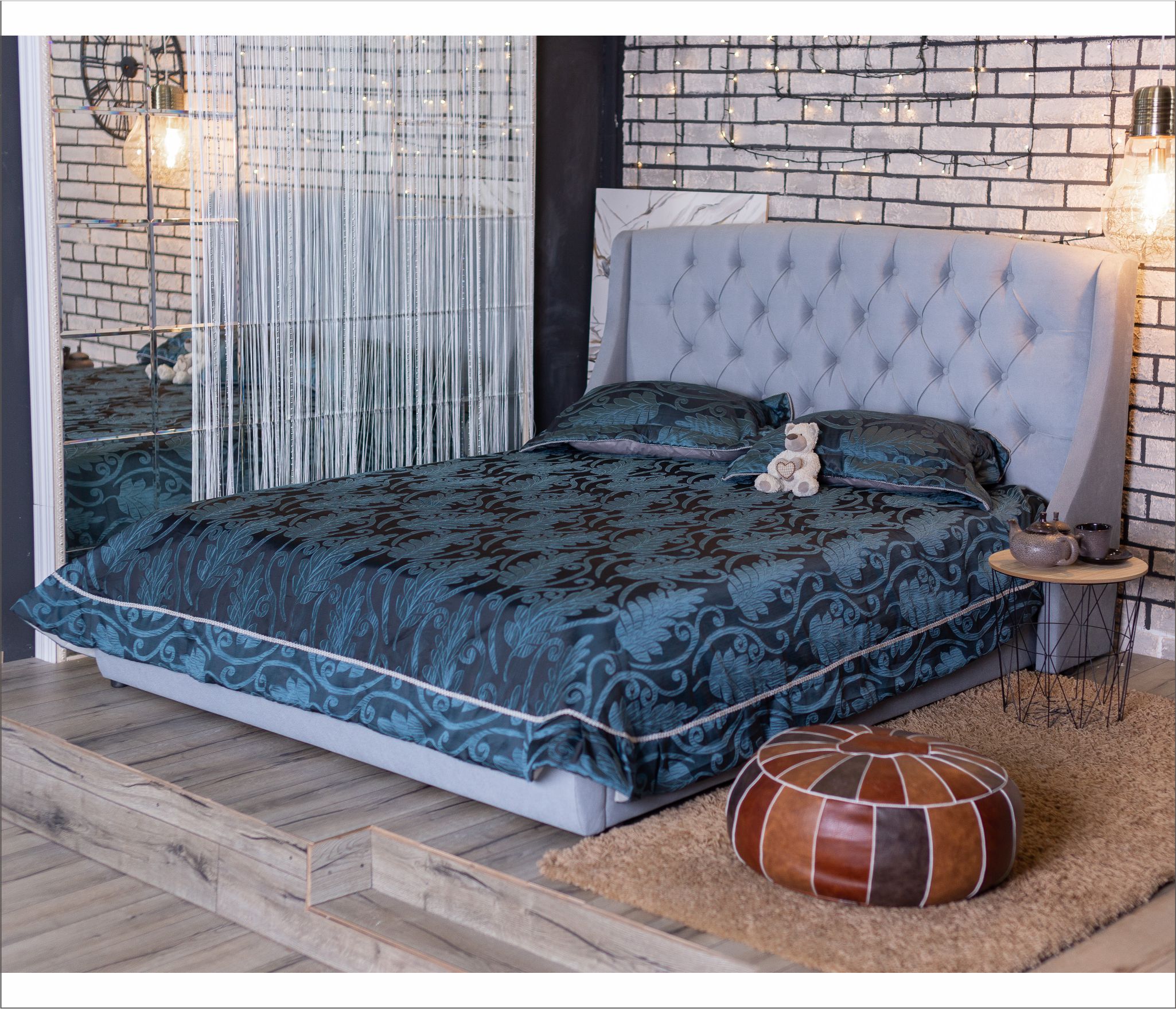 Основной акцент сделан на высоком изголовье с мягкими боковинами – “ушками”. Мягкая спинка изящно оформлены каретной стяжкой с декоративными пуговицами в тон изголовья.
