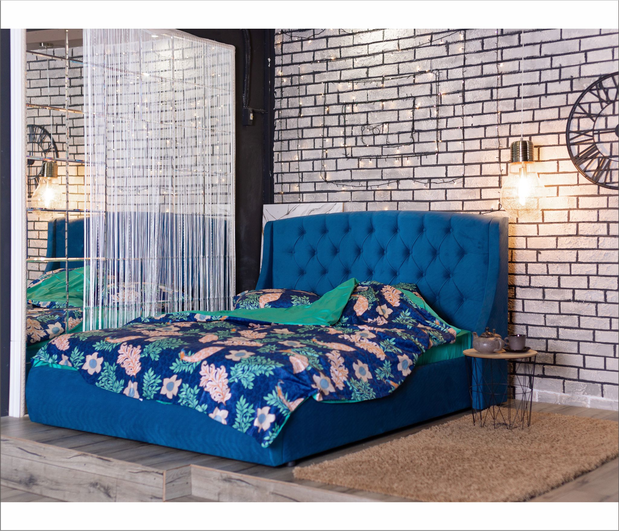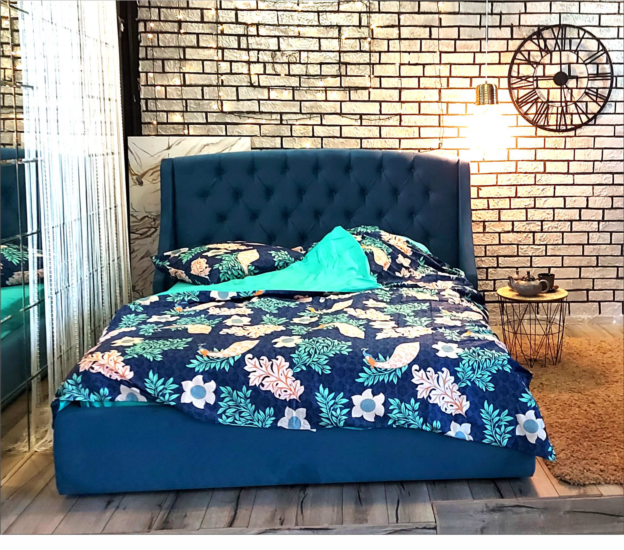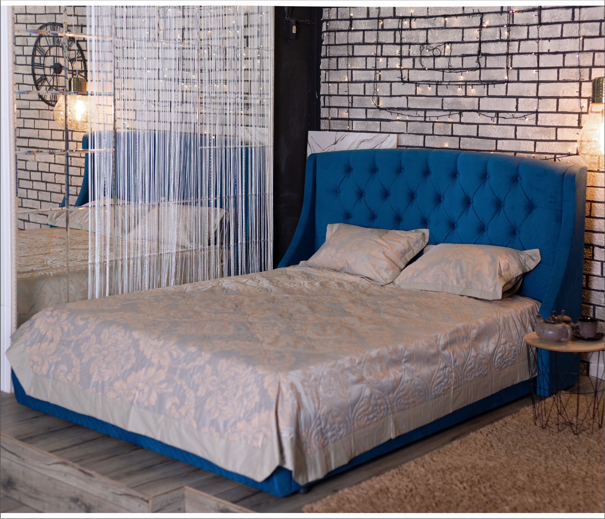 Основной акцент сделан на высоком изголовье с мягкими боковинами – “ушками”. Мягкая спинка изящно оформлены каретной стяжкой с декоративными пуговицами в тон изголовья.