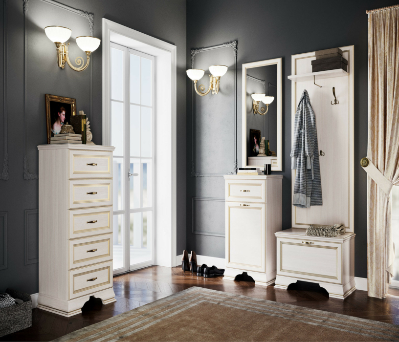 В состав модульной программы входят три вида шкафов. Четырехдверный шкаф комплектуется на фабрике глухими боковыми фасадами, центральные двери к нему предлагаются на выбор: с зеркалом или без. Двух- и трехстворчатые шкафы укомплектовываются фасадами в зависимости от предпочтений покупателя. Коллекцию дополняют два вида комодов (традиционный и высокий) и кровать с подъемным ортопедическим основанием трех типоразмеров, оснащенная вместительным бельевым ящиком.