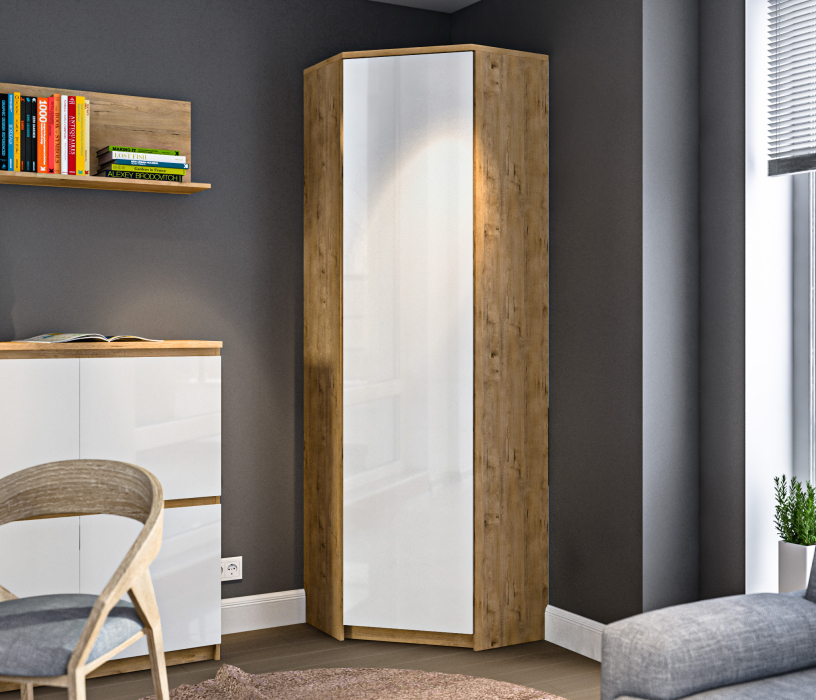 Шкаф привлек своими размерами, интересной текстурой, ценой- попали в акцию -12%.Компактный угловой шкаф, к нему был докуплен пенал из этой же серии, получился отличный комплект!!! Собирали сами, после сборки двух створчатого шкафа из этой же коллекции сборка заняла всего полтора часа, единственный минус- неглубоко была прорезана дырка для петли двери, пришлось аккуратно её увеличить, т.к. петля не устанавливалась впритык, ну и инструкция требует усовершенствования!!!