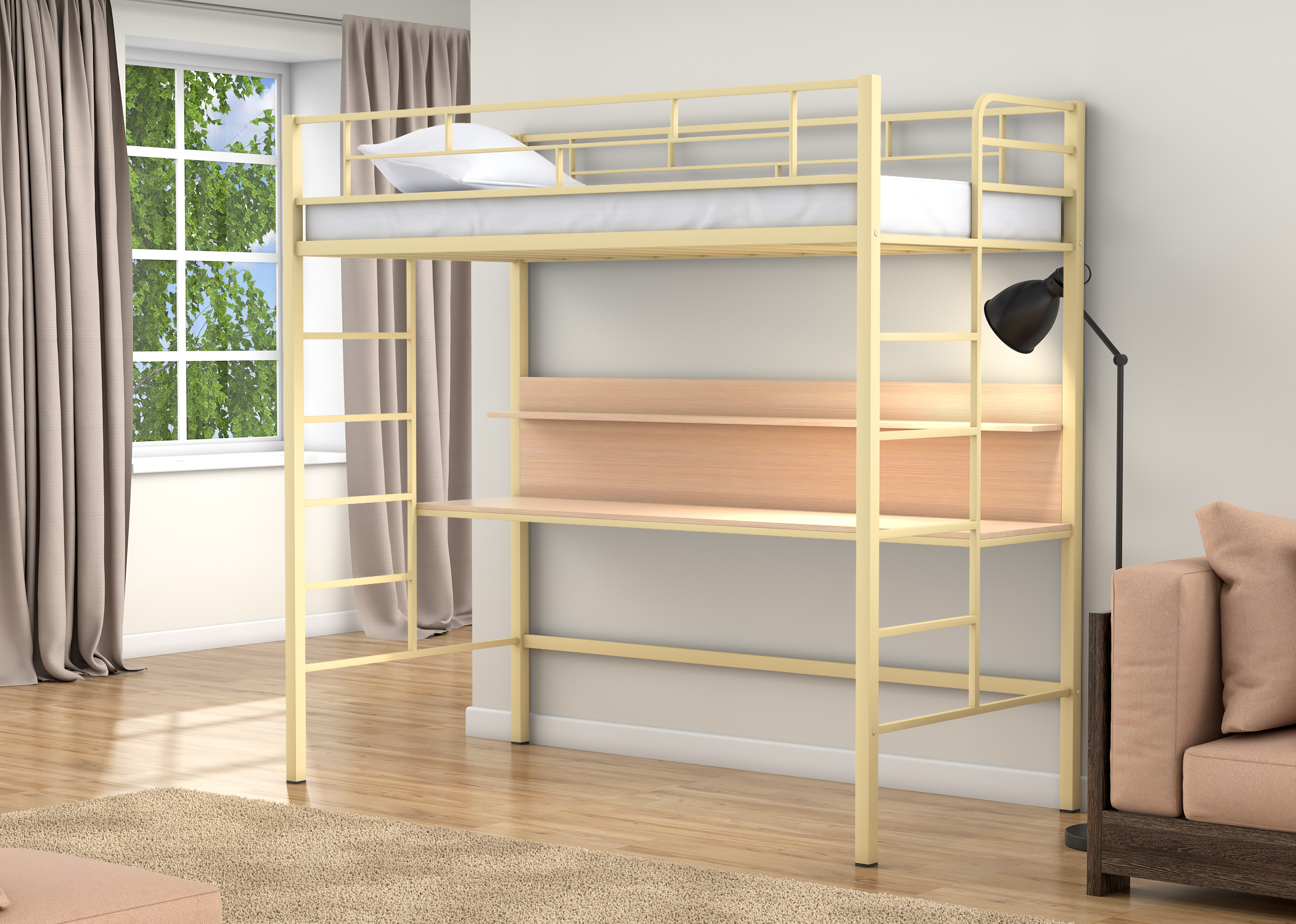 Кровать-чердак Амстердам Слоновая кость от Фабрики мебели 4 Сезона. Каркас выполнен из прочного металла, покрытого порошковой краской. Основание под матрас сварное, ламели металлические профиль 30х15 мм. Выдерживает нагрузку до 150 кг. Ножки кровати имеют пластиковые заглушки. Лестницы сварные, расположены с обеих сторон с торцов кровати. В комплект входит рабочая зона из ЛДСП 16 мм, крепится к основанию кровати. Рабочая поверхность стола 55х190 см, полка 15х190 см. В нашем ассортименте представлен большой выбор матрасов собственного производства из высококачественных материалов по низким ценам.