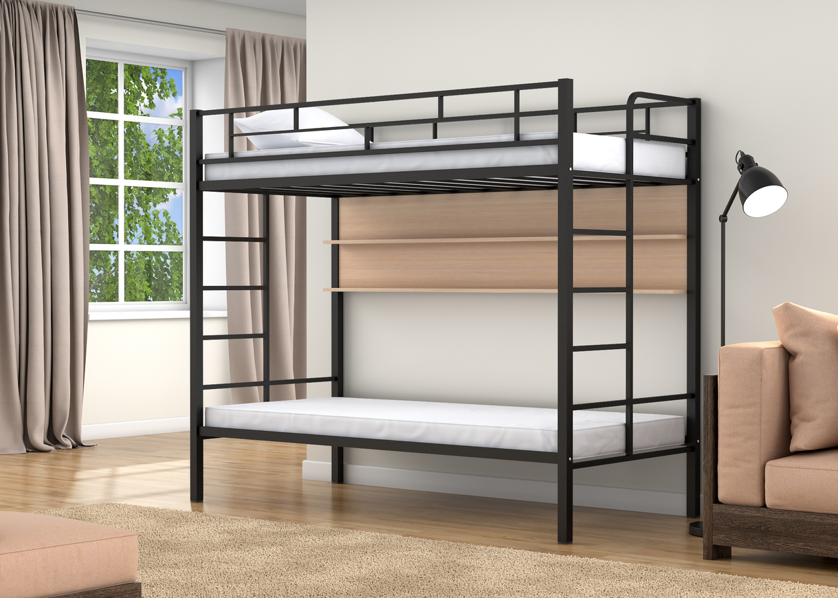 Спальные места 90х190 см., прочный стальной каркас, покрашен безопасной не имеющей запаха порошковой краской. Цвета на выбор: коричневый, черный, слоновая кость. Дополнительно комплектуется выдвижными ящиками и навесной полкой, материал ЛДСП 16 мм., цвета на выбор: дуб молочный или венге.