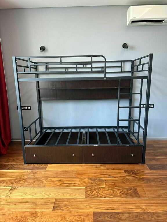 Спальные места 120х190 см., прочный стальной каркас, покрашен безопасной не имеющей запаха порошковой краской. Цвета на выбор: коричневый, черный, слоновая кость. Дополнительно комплектуется выдвижными ящиками и навесной полкой, материал ЛДСП 16 мм., цвета на выбор: дуб молочный или венге.