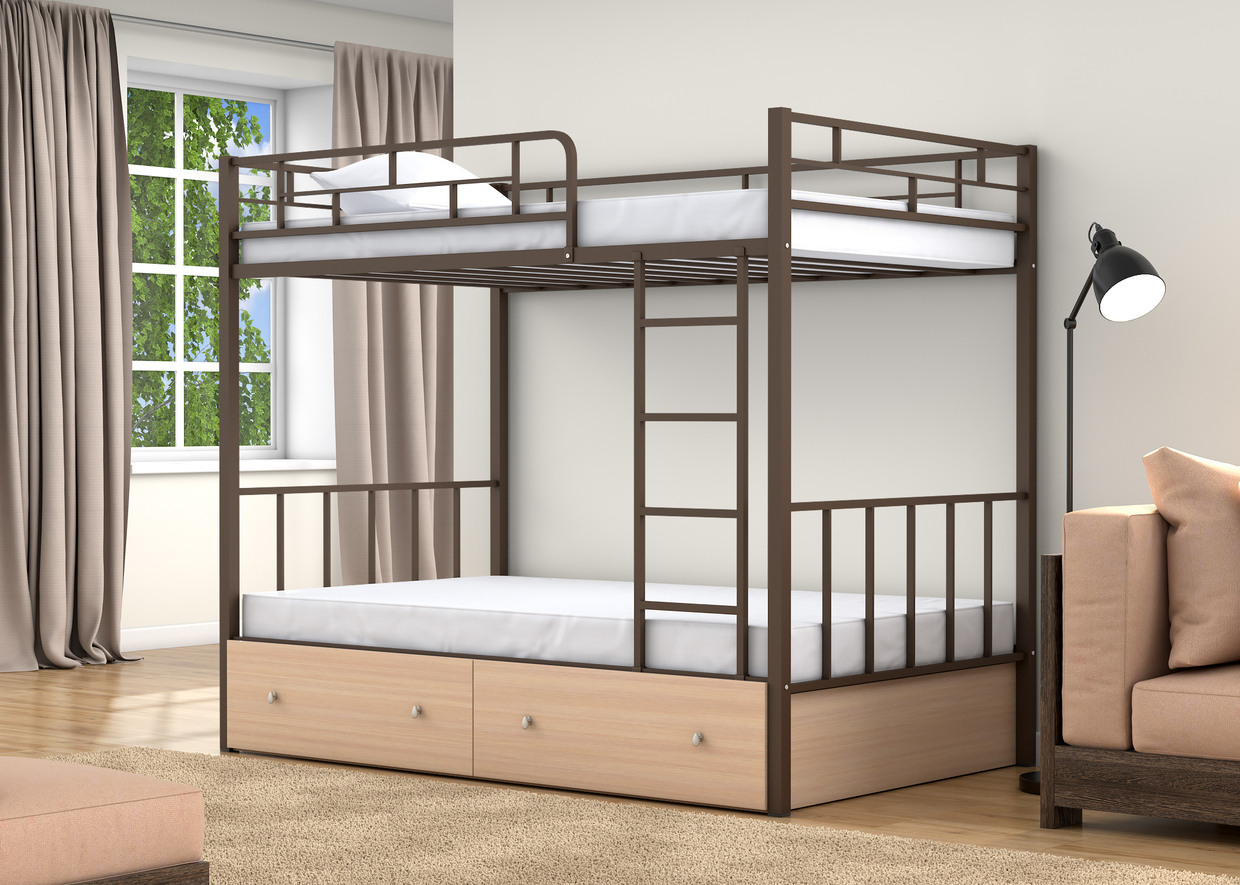 Спальные места 120х190 см., прочный стальной каркас, покрашен безопасной не имеющей запаха порошковой краской. Цвета на выбор: коричневый, черный, слоновая кость. Дополнительно комплектуется выдвижными ящиками и навесной полкой, материал ЛДСП 16 мм., цвета на выбор: дуб молочный или венге.
