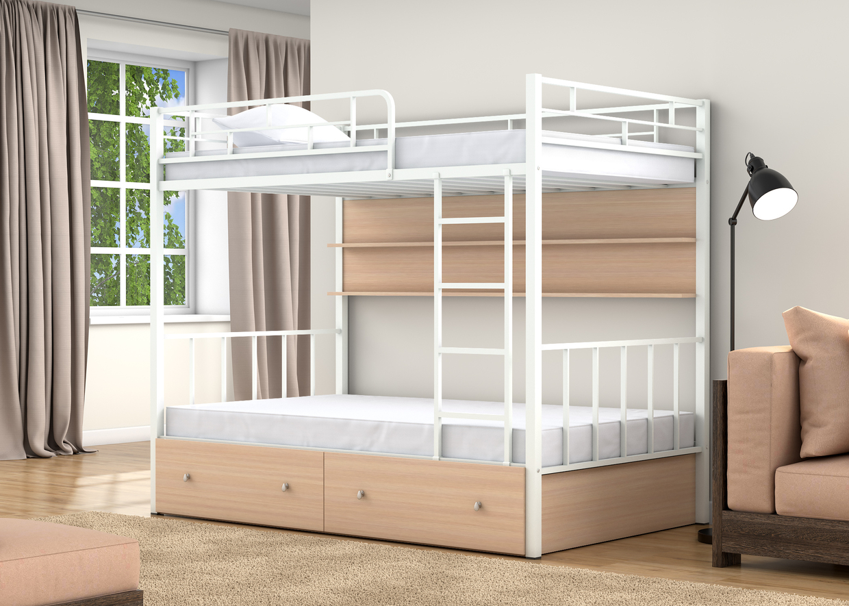Спальные места 120х190 см., прочный стальной каркас, покрашен безопасной не имеющей запаха порошковой краской. Цвета на выбор: коричневый, черный, слоновая кость. Дополнительно комплектуется выдвижными ящиками и навесной полкой, материал ЛДСП 16 мм., цвета на выбор: дуб молочный или венге.