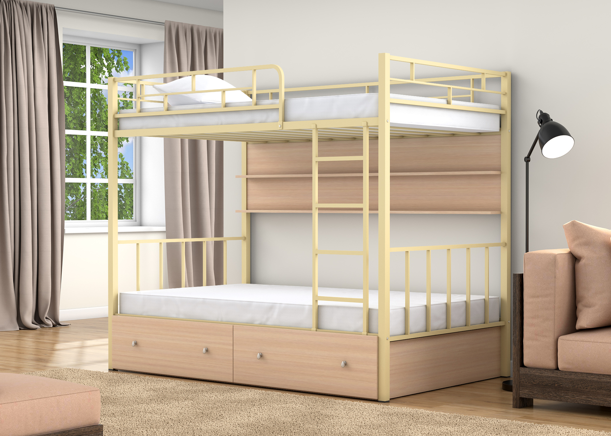 Спальные места 120х190 см., прочный стальной каркас, покрашен безопасной не имеющей запаха порошковой краской. Цвета на выбор: коричневый, черный, слоновая кость. Дополнительно комплектуется выдвижными ящиками и навесной полкой, материал ЛДСП 16 мм., цвета на выбор: дуб молочный или венге.