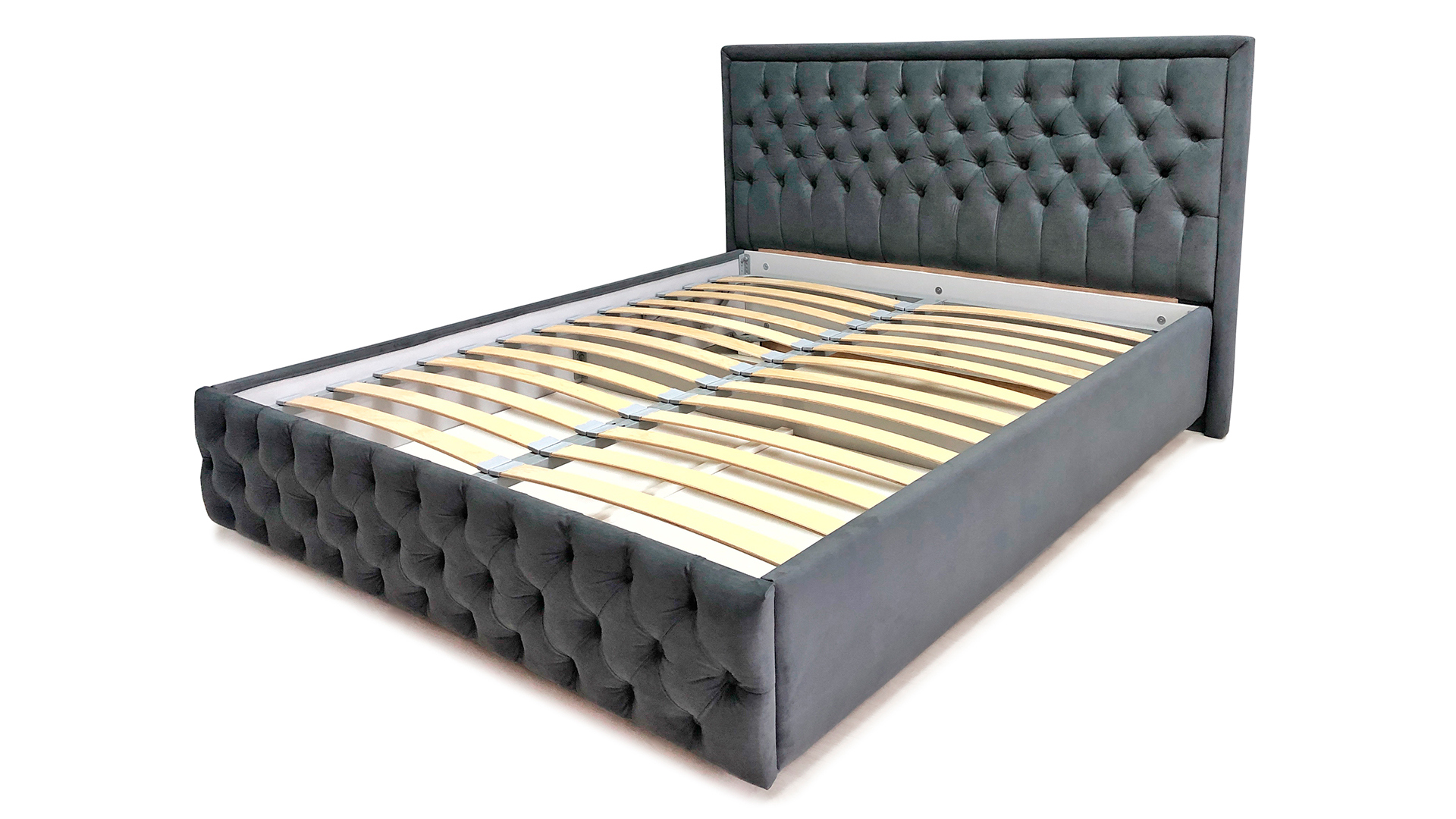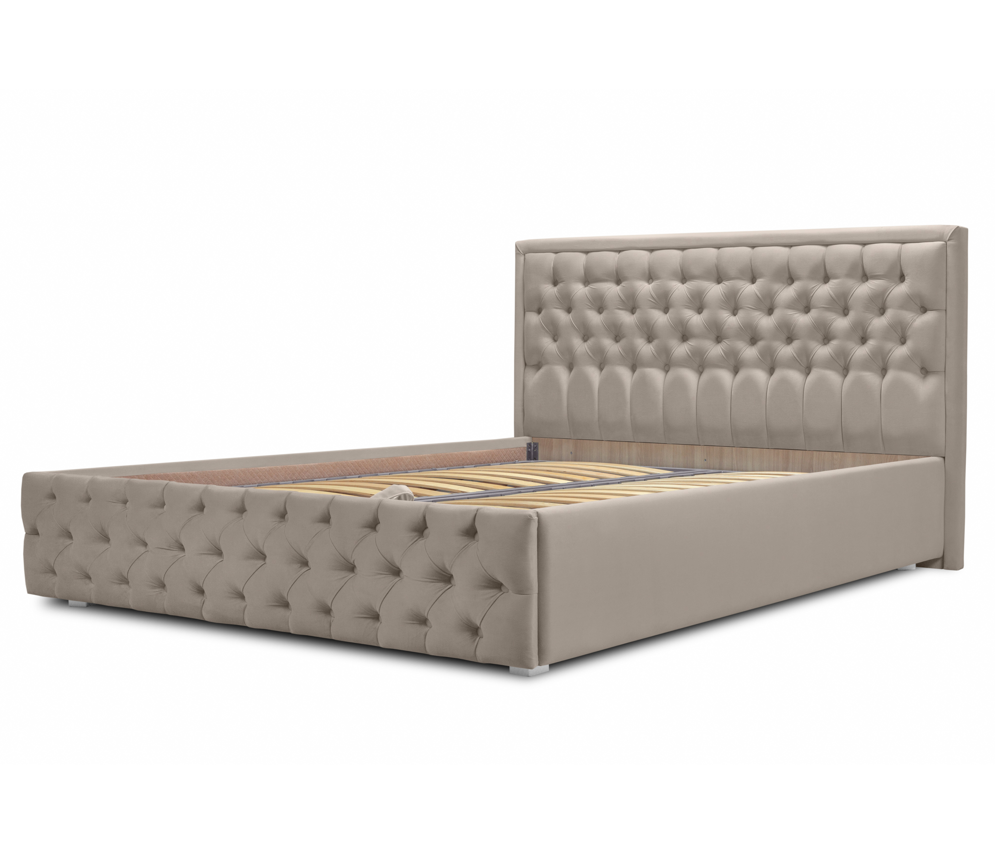 Высокое изголовье выполнено в каретной стяжке ручной работы и декорировано пуговицами.