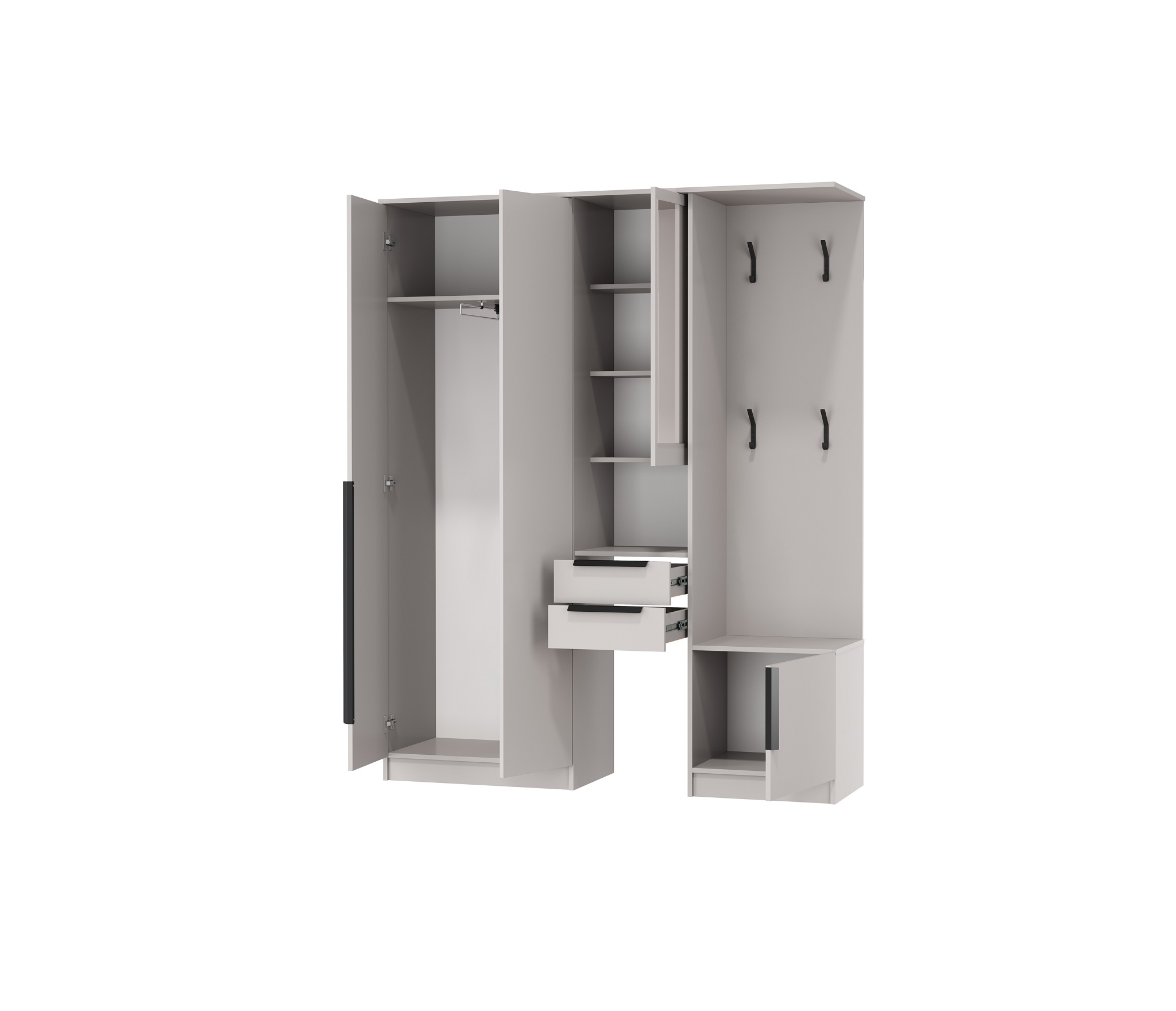 Конструкция прихожей включает в себя всё необходимое для поддержания порядка: двух дверный шкаф со штангой для плечиков внутри, распашная дверка с зеркалом скрывает полки для хранения, 2 выдвижных ящика для мелочей, 4 крючка для верхней одежды и небольшая обувница с одной распашной дверкой внизу.
