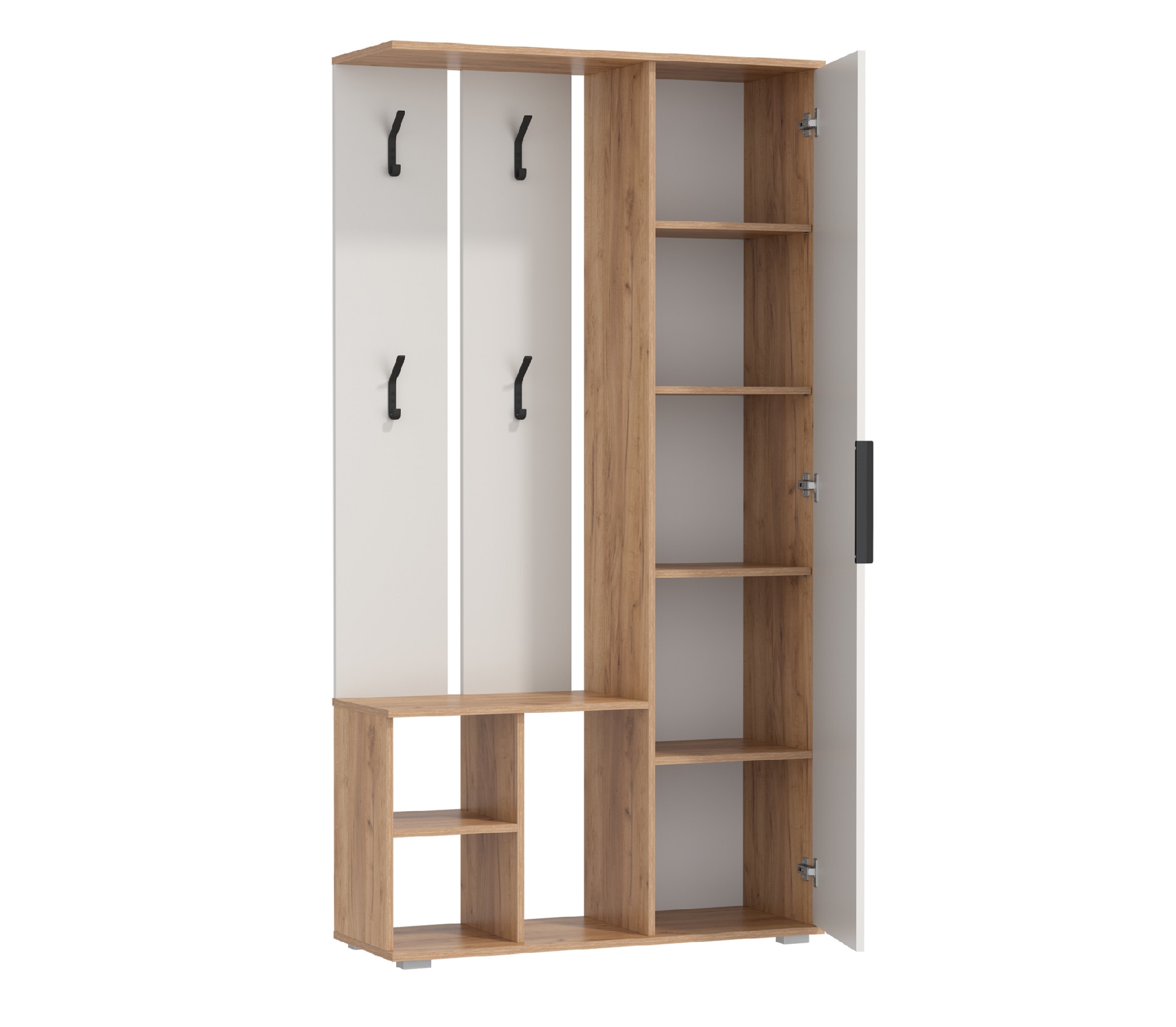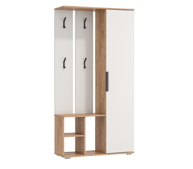 Конструкция мини-прихожей включает в себя крючки для верхней одежды, полки для хранения за распашной дверкой и открытые ниши снизу.