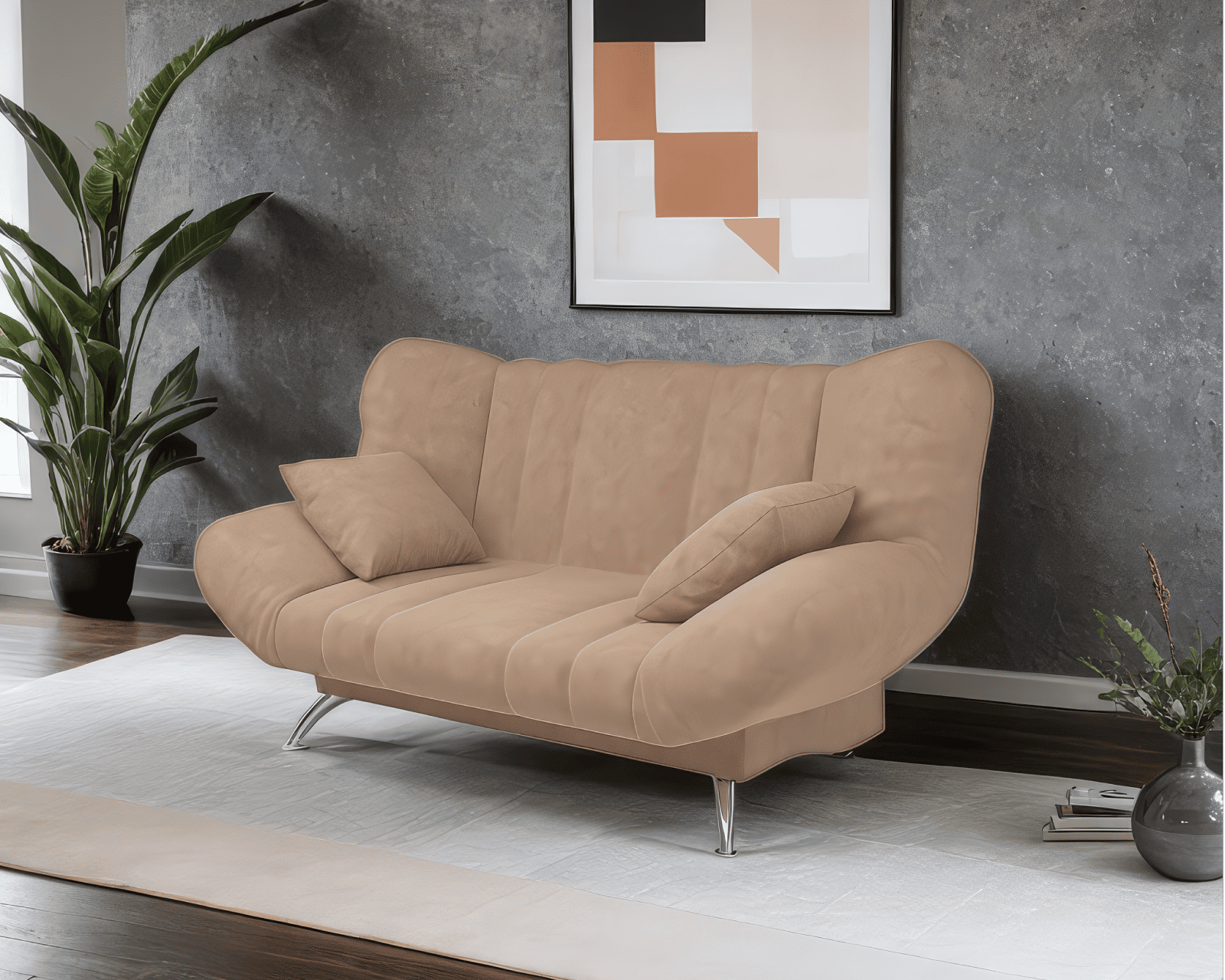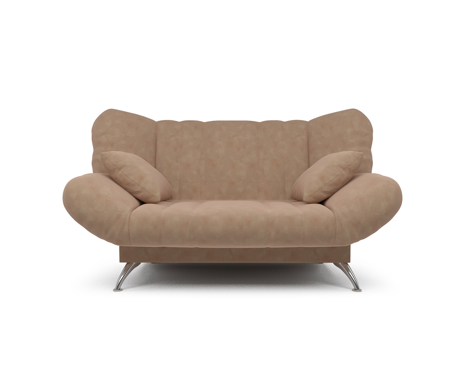 Высокие металлические ножки придают дивану современный и стильный вид, что делает его отличным акцентом в интерьере. Две декоративные подушки добавляют дополнительный комфорт и приятные акценты.