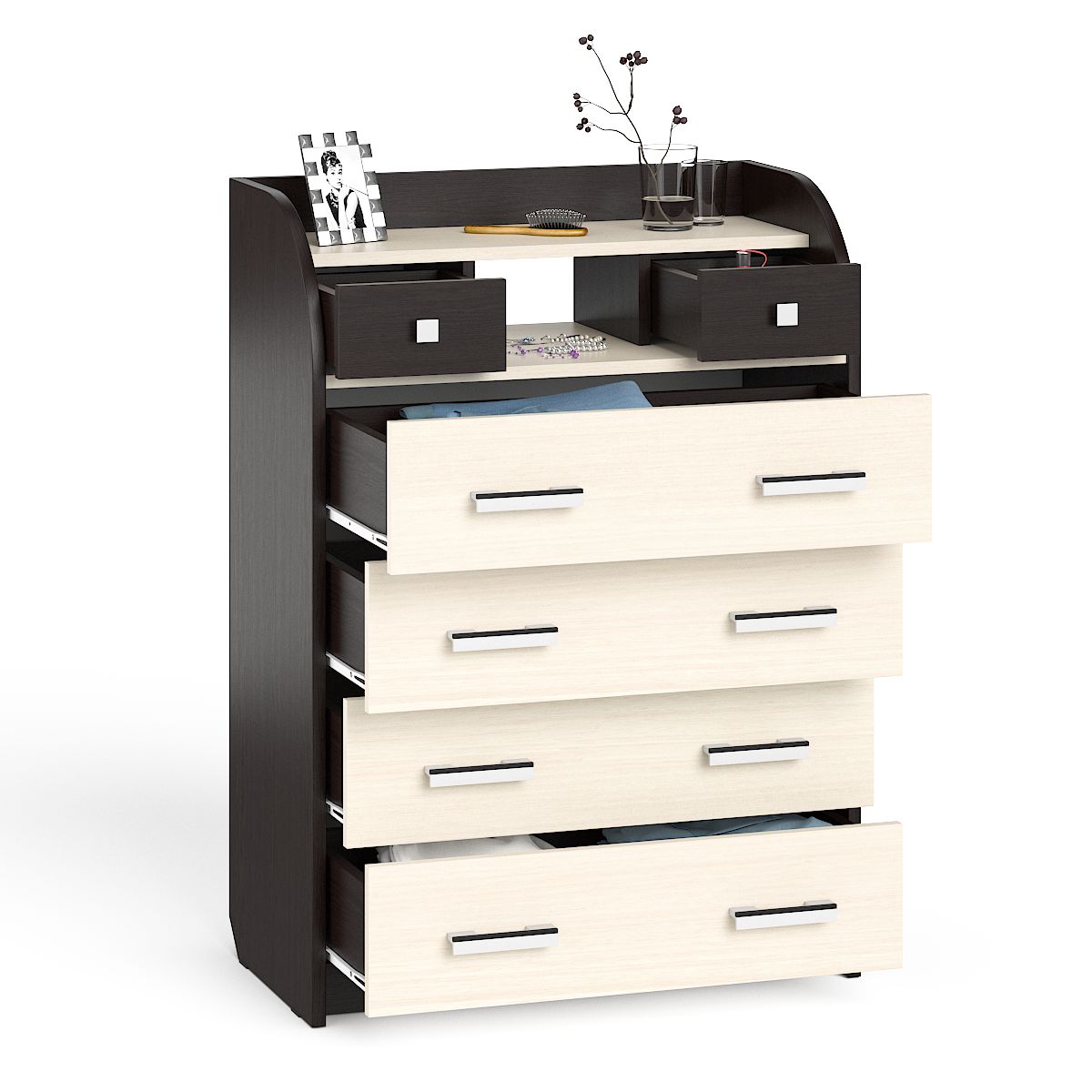 Комод имеет четыре больших широких ящика и два небольших верхних ящичка, между которыми расположилась открытая ниша. В ящиках достаточно места для хранения одежды, белья, вещей, игрушек, посуды, косметики или документов. Широкие ящики закреплены на роликовых направляющих, что обеспечивает плавное и лёгкое их выдвижение. Пара верхних выдвижных ящичков выполнены в виде удобных незакреплённых шкатулочек, расположенных в нишах.