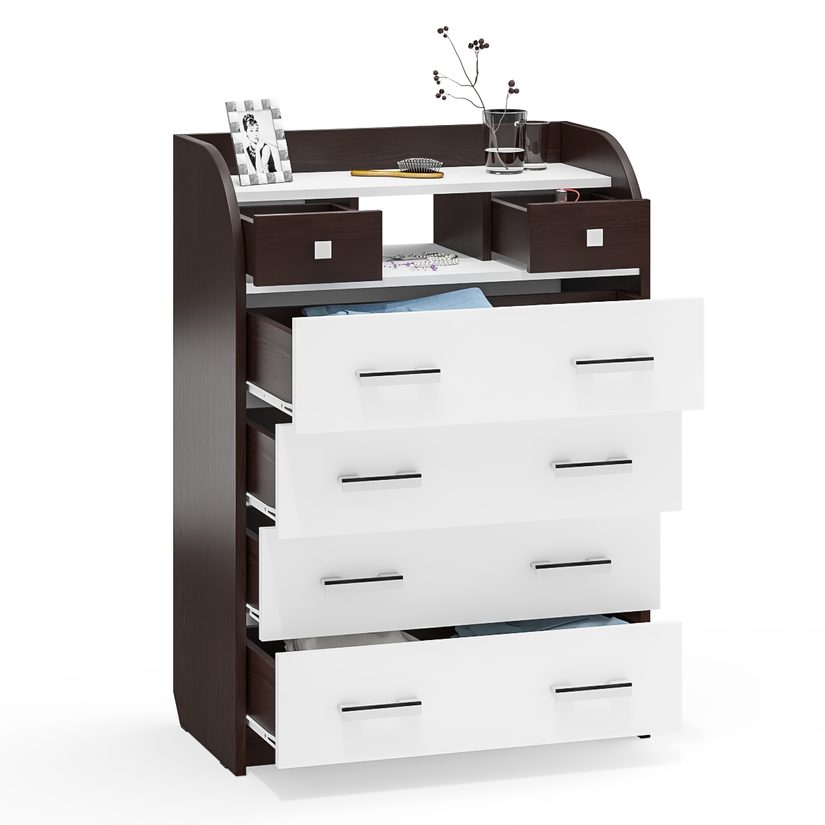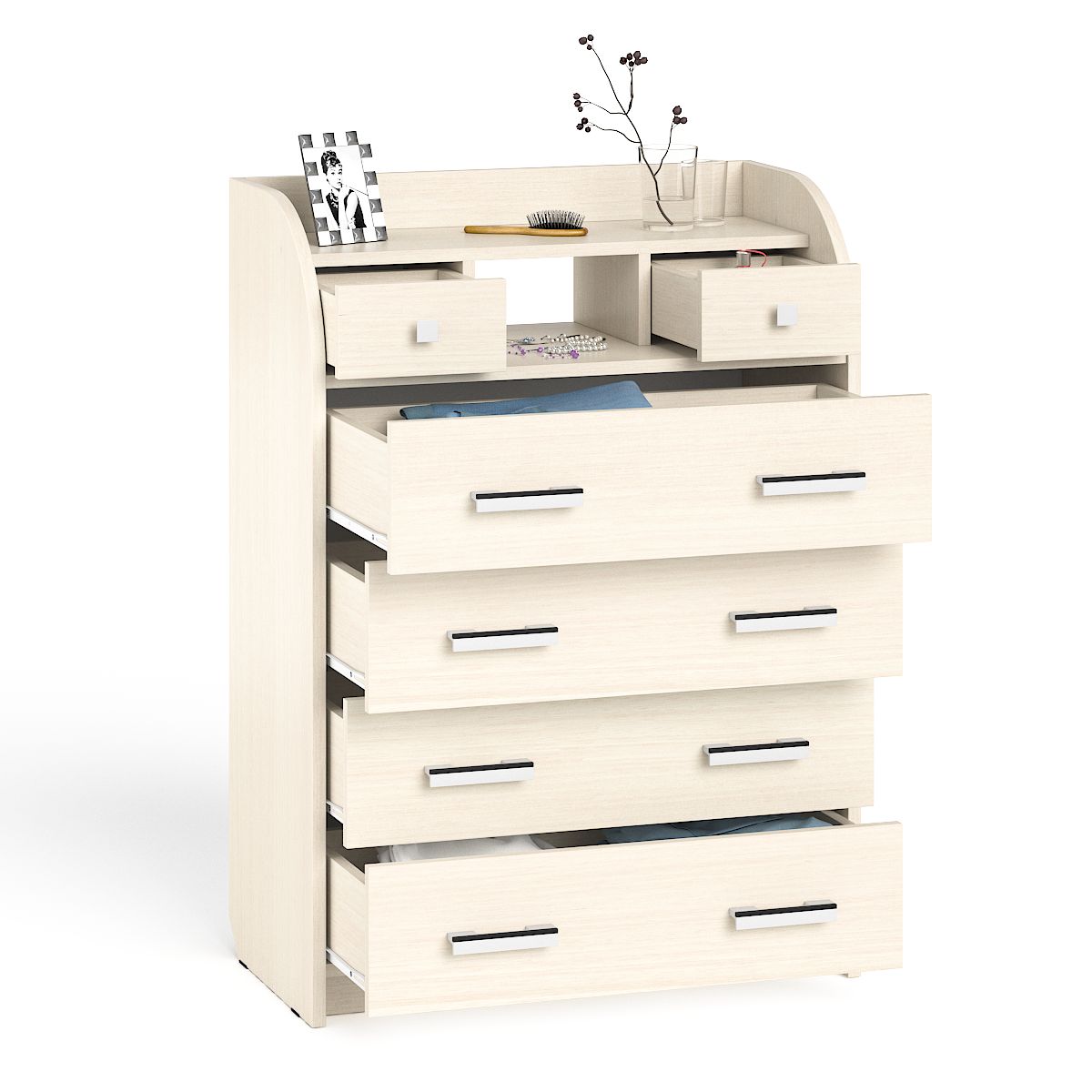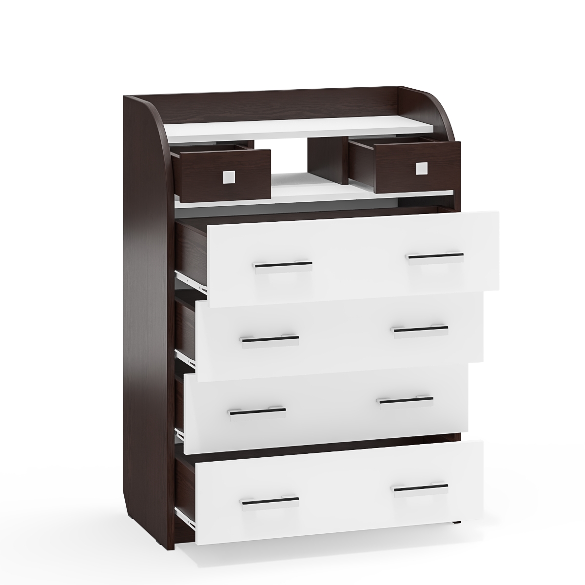 Комод имеет четыре больших широких ящика и два небольших верхних ящичка, между которыми расположилась открытая ниша. В ящиках достаточно места для хранения одежды, белья, вещей, игрушек, посуды, косметики или документов. Широкие ящики закреплены на роликовых направляющих, что обеспечивает плавное и лёгкое их выдвижение. Пара верхних выдвижных ящичков выполнены в виде удобных незакреплённых шкатулочек, расположенных в нишах.