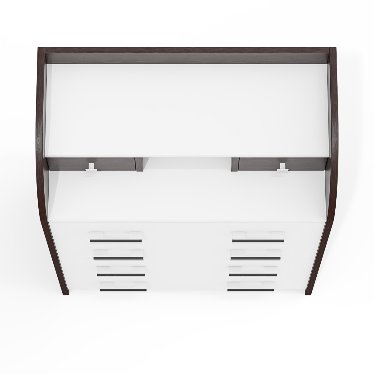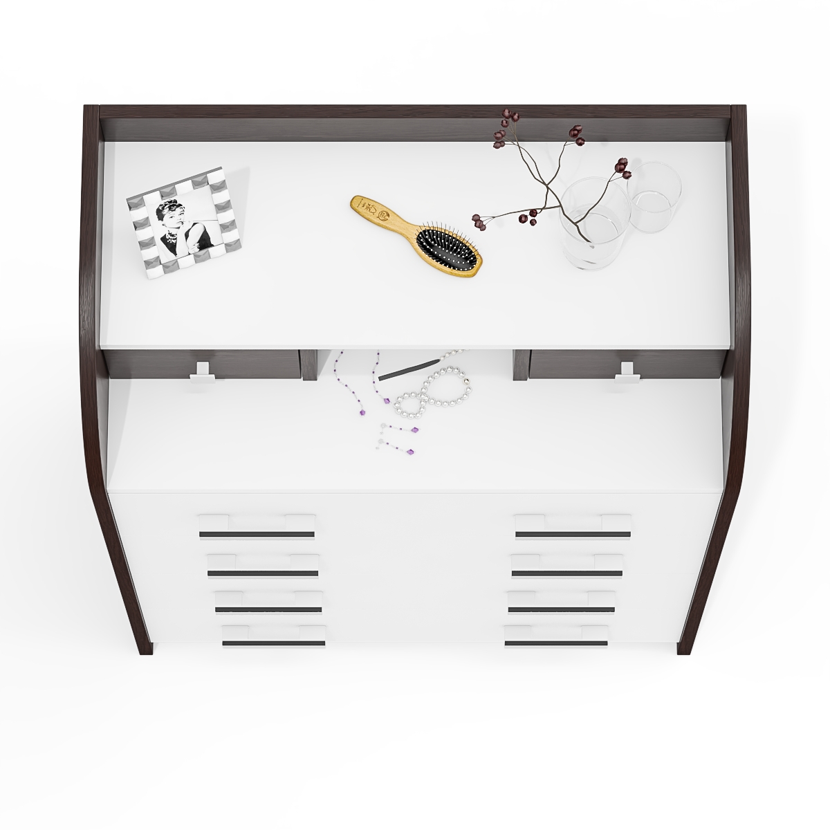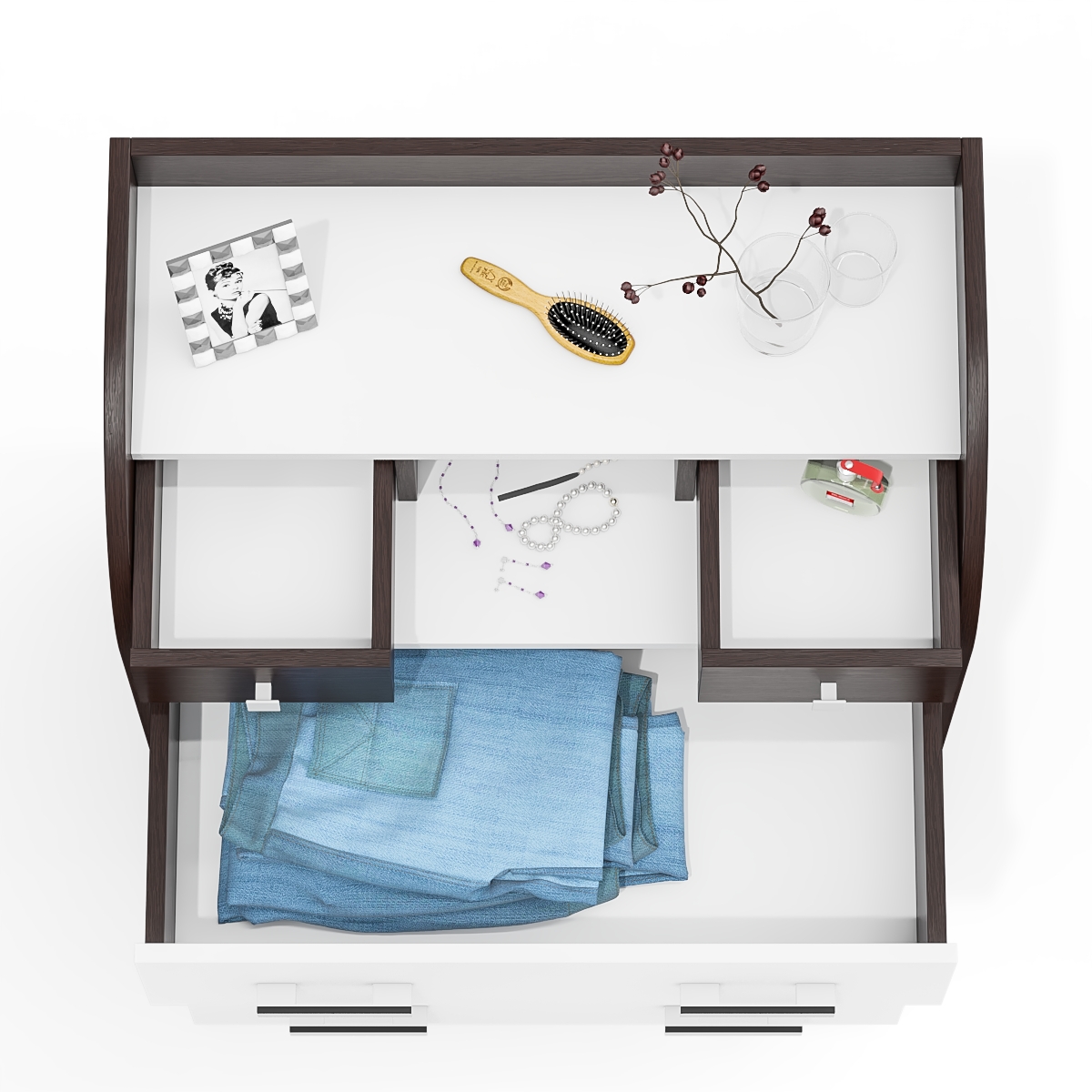 Комод имеет четыре больших широких ящика и два небольших верхних ящичка, между которыми расположилась открытая ниша. В ящиках достаточно места для хранения одежды, белья, вещей, игрушек, посуды, косметики или документов. Широкие ящики закреплены на роликовых направляющих, что обеспечивает плавное и лёгкое их выдвижение. Пара верхних выдвижных ящичков выполнены в виде удобных незакреплённых шкатулочек, расположенных в нишах.