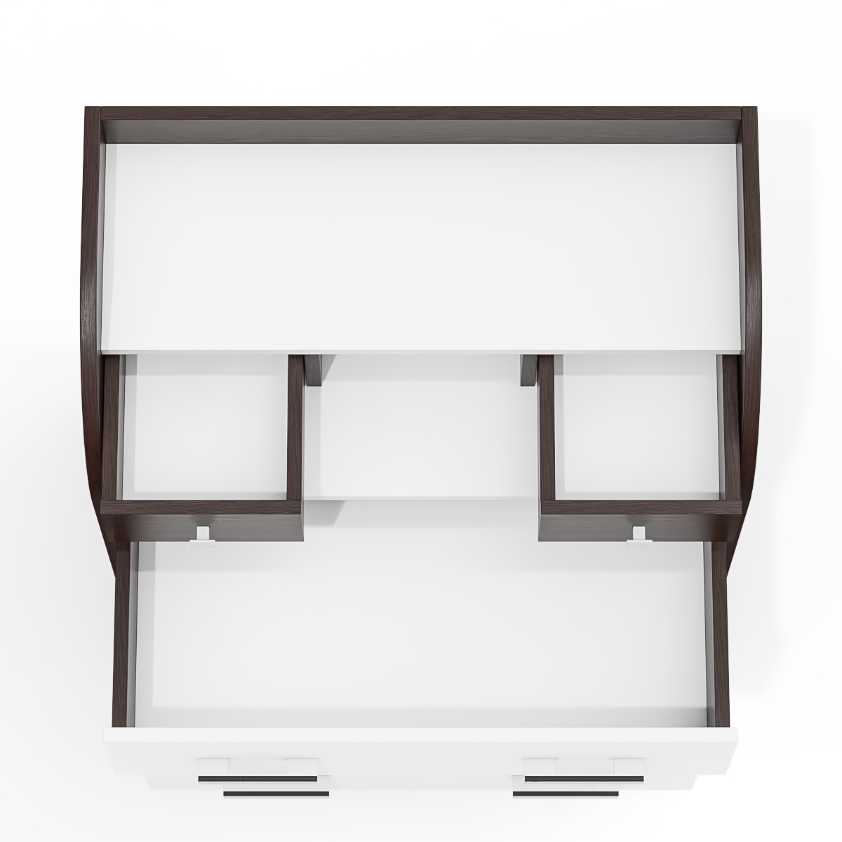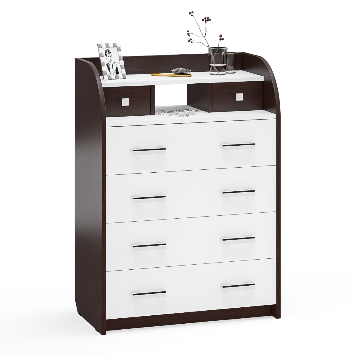 Комод имеет четыре больших широких ящика и два небольших верхних ящичка, между которыми расположилась открытая ниша. В ящиках достаточно места для хранения одежды, белья, вещей, игрушек, посуды, косметики или документов. Широкие ящики закреплены на роликовых направляющих, что обеспечивает плавное и лёгкое их выдвижение. Пара верхних выдвижных ящичков выполнены в виде удобных незакреплённых шкатулочек, расположенных в нишах.