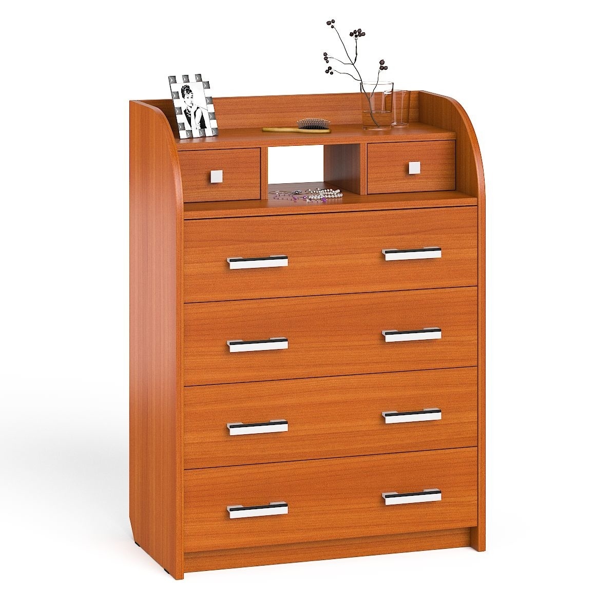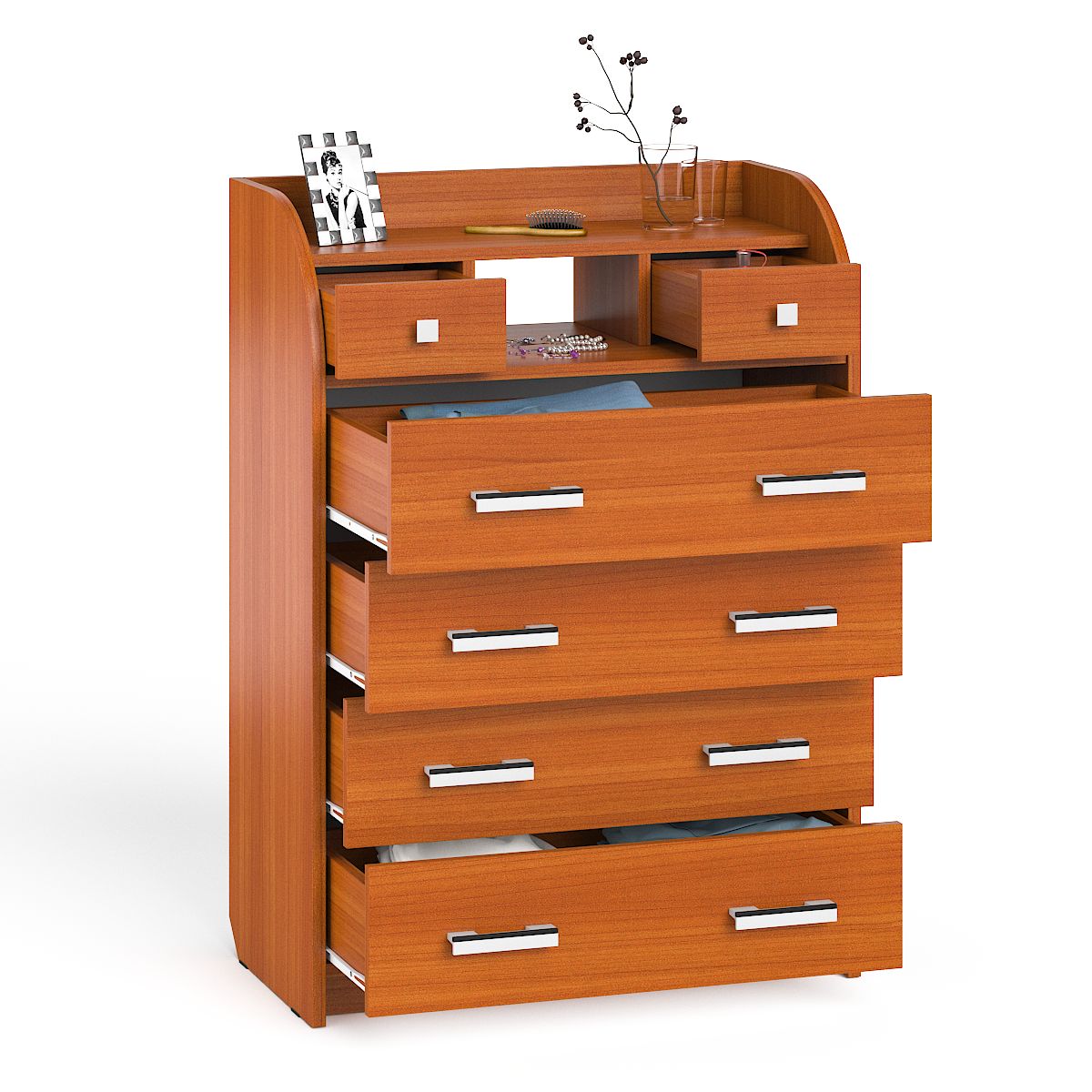 Комод имеет четыре больших широких ящика и два небольших верхних ящичка, между которыми расположилась открытая ниша. В ящиках достаточно места для хранения одежды, белья, вещей, игрушек, посуды, косметики или документов. Широкие ящики закреплены на роликовых направляющих, что обеспечивает плавное и лёгкое их выдвижение. Пара верхних выдвижных ящичков выполнены в виде удобных незакреплённых шкатулочек, расположенных в нишах.