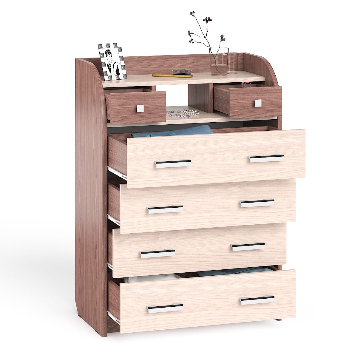 Комод имеет четыре больших широких ящика и два небольших верхних ящичка, между которыми расположилась открытая ниша. В ящиках достаточно места для хранения одежды, белья, вещей, игрушек, посуды, косметики или документов. Широкие ящики закреплены на роликовых направляющих, что обеспечивает плавное и лёгкое их выдвижение. Пара верхних выдвижных ящичков выполнены в виде удобных незакреплённых шкатулочек, расположенных в нишах.