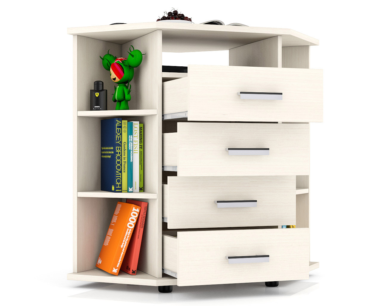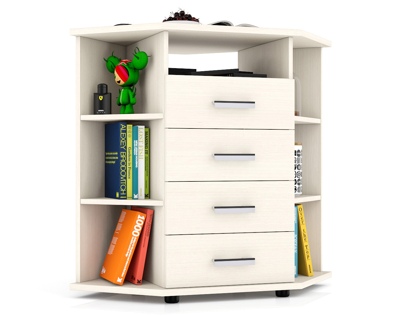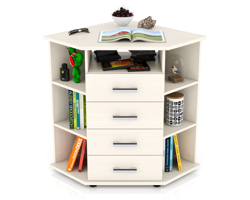 Угловой комод открытые полки и ниша сверху С-МД-К14П - многофункциональный предмет обстановки современного дома. Модный дизайн, оригинальная форма и предлагаемая интересная цветовая палитра делают комод достойным Вашего выбора. Комод оборудован четырьмя вместительными выдвижными ящичками, нишей над ними, и боковыми открытыми нишами с двумя полками. На ящичках установлены практичные ручки, обеспечивающие комфортный доступ и универсальное сочетание с любым интерьером. Удобная угловая конструкция и большая столешница комода существенно расширяют горизонты его востребовательности. Комод может послужить и удобной тумбой под телевизор, и дамским туалетным столиком, и тумбой для канцелярии и документов в офисе. И везде комод стильно выделит и украсит отведенный ему уголок и профессионально выполнит поставленную задачу! Долгую службу комода гарантируют современный способ производства, высококачественные экологически безопасные материалы, фурнитура. Ламинированная плита, из которой сделан комод, имеет гигиенический сертификат Е1 и относится к самой безопасной группе ДСП. Края столешницы комода обработаны кромкой ABS - 2 мм., остальные детали кромкой ABS - 0,4 мм. Мебельная кромка ABS - самая прогрессивная форма защиты торцов изделия, ударопрочная, без деформации и выделения вредных веществ. Модель установлена на пластиковые подпятники для защиты поверхности пола от повреждений. Угловой комод открытые полки и ниша сверху С-МД-К14П - практичное использование угла комнаты - стильно и с пользой!