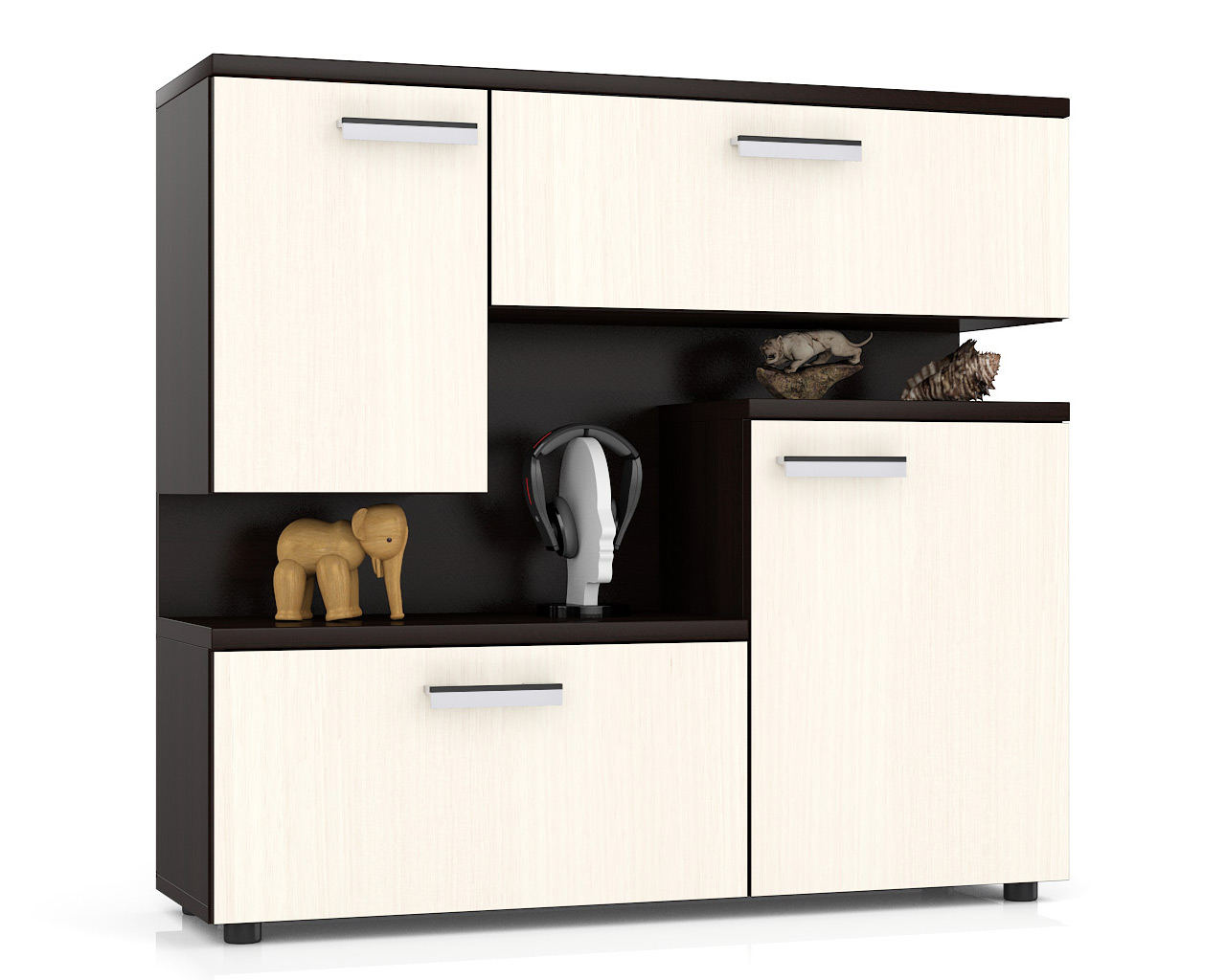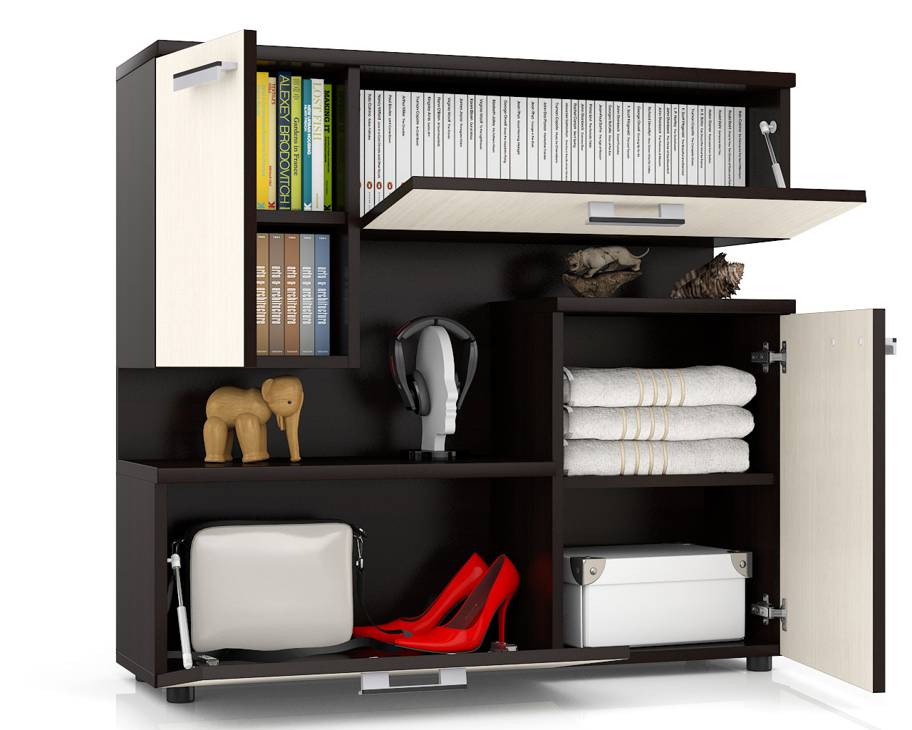 Устойчивая, вместительная тумба с четырьмя закрытыми отделениями и открытыми нишами - отличная подставка для домашнего кинотеатра. Широкий верхний горизонт тумбы послужит надёжной полкой для установки телевизора любой диагонали. Для всей входящей в Ваш ТВ-комплекс техники и технологических мелочей места тоже хватит, а может и останется для других атрибутов отдыха! Тумба оборудована двумя вместительными отделениями с полкой за распашной дверкой и двумя нишами без полок за откидными дверками. Кроме того, оригинальная конструкция тумбы выделяет несколько открытых ниш, очень удобных для видео- и аудиоаппаратуры, декора, фото. В гостиной тумба может стать центром сосредопочения предметов семейных развлечений - разместить книги, видиотеку, игры или бар. Распределив тумбу в другую комнату, Вы сможете расширить её функции и практично решит массу проблем «складского» направления. Это и хранение документации в кабинете, и эргономический комфорт школьного уголка, и существенная часть гардеробного комплекса детской. Стильный дизайн, интересная форма тумбы и модное сочетание цветовой гаммы поддержат гармонию вкуса Вашей современной обстановки. Изготовлена тумба из высококачественных, экологически безопасных материалов на суперсовременном оборудовании. Ламинированная плита имеет гигиенический сертификат Е1 и относится к самой безопасной группе ДСП. Обязательная защита всех деталей тумбы противоударной кромкой ABS толщиной 2 мм. и 0,44 мм. придаёт изделию эстетичный вид. В процессе производства мебель прошла ступенчатый контроль и имеет все требующиеся сертификаты, подтверждающие её отличное качество. Поставляется тумба в разобранном виде, надёжно упакованной с необходимой фурнитурой и подробной инструкцией по сборке.