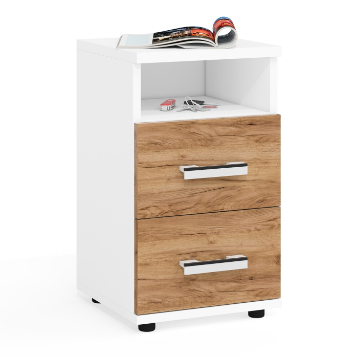 Тумба имеет верхнюю открытую нишу и два выкатных ящика. Роликовые направляющие обеспечивают лёгкий ход ящиков тумбочки. Небольшие, но очень вместительные ящики тумбочки будут надёжно хранить в идеальном порядке Ваши вещи. На тумбочке отлично можно разместить ночник, оставить книгу, телефон, фото семьи или ночной крем. Также тумба может найти своё место в прихожей, детской, кабинете, в гостиной или на балконе.