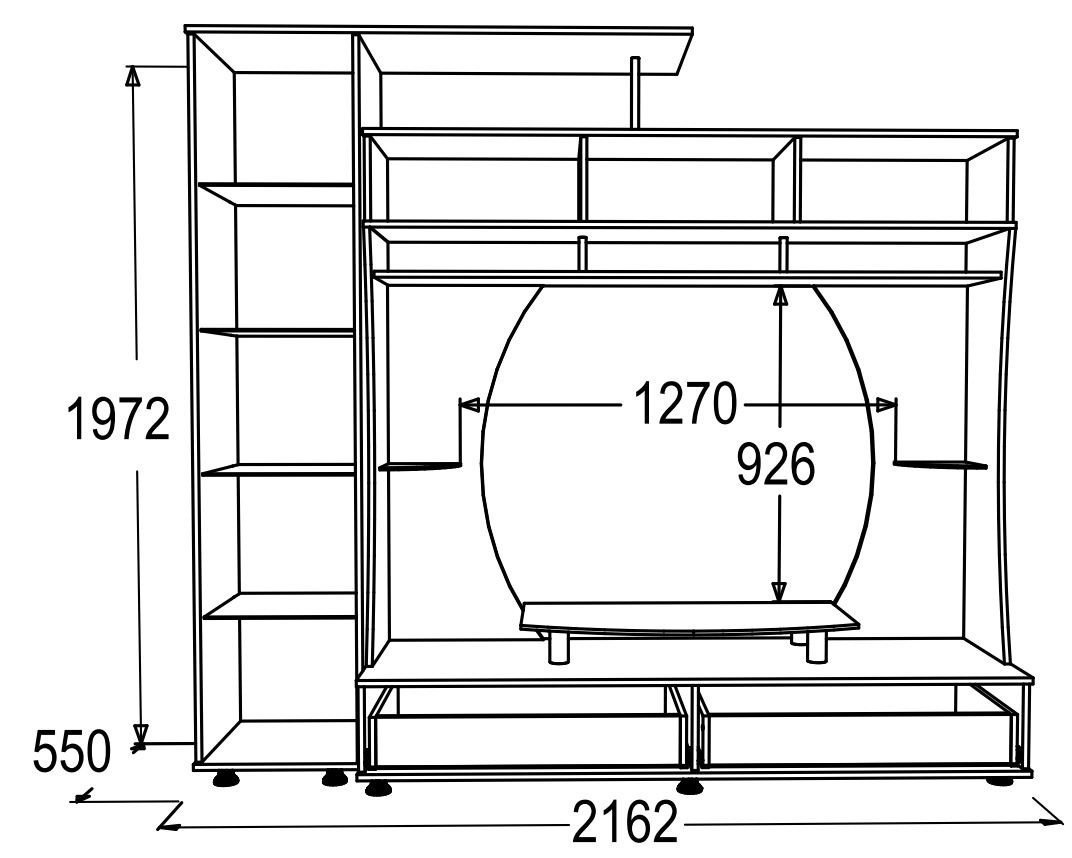В составе: шкаф левый со стеклом 450х440х1972 мм, тумба для ТВ с 2мя ящиками 550х1722х302 мм, верхний ярус с 3мя отделениями с откидными дверками.