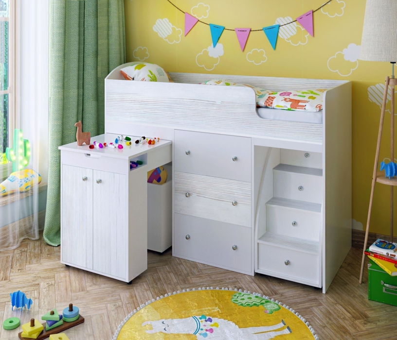 Стильная и красивая кровать-чердак от производителя ЯРОФФ представлена в разных цветовых сочетаниях, а потому позволит обустроить как комнату девочки, так и мальчика. Компактная выдвижная лестница с ящиками, ведущая на второй ярус к спальному месту, бережет пространство комнаты. Также у кровати-чердака имеется выдвижной столик, на котором можно рисовать или даже делать уроки, и ящички для хранения карандашей, альбомов и других мелочей.