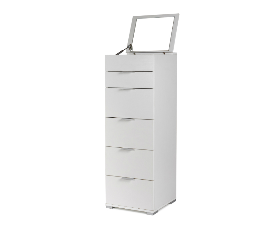 Комод НК 6 оснащен пятью выдвижными ящиками и отсеком с откидной крышкой с амортизатором для фиксации, откидная крышка комода оснащена зеркалом. Комод НК 6 очень удобен, иак как не занимает много места и совмещает в себе функции комода и трюмо.