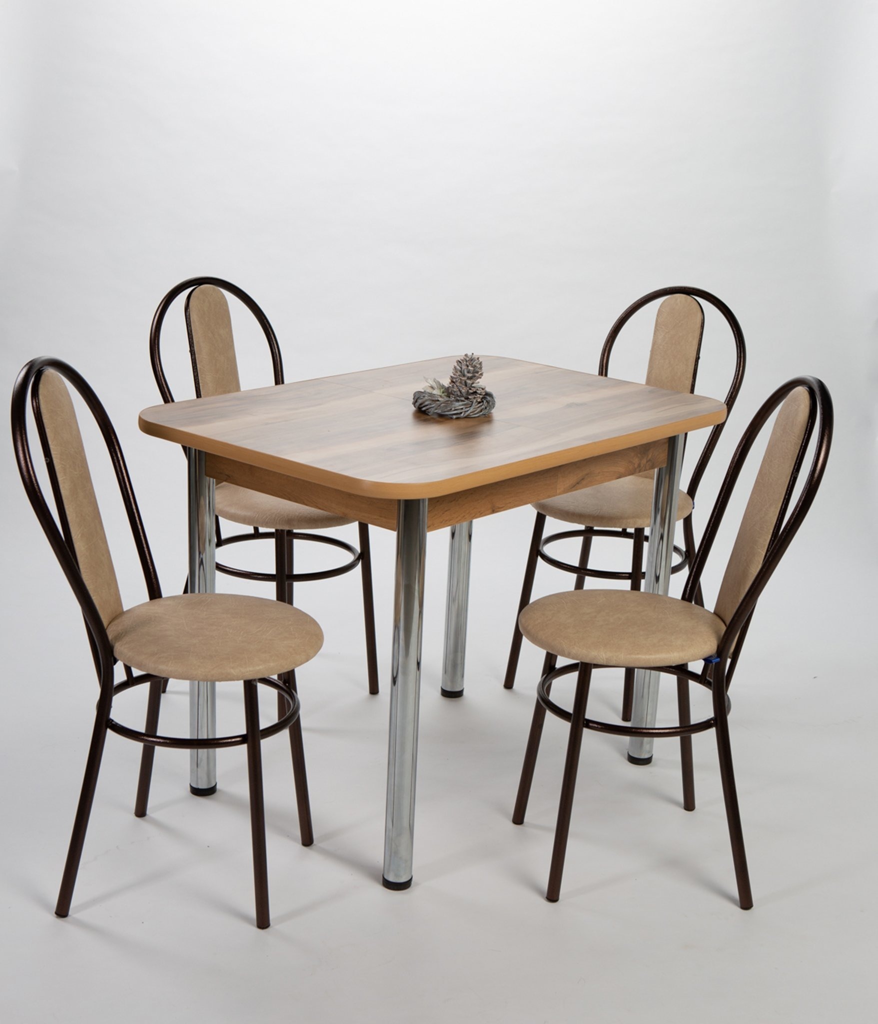 Обеденная группа Ритм состоит из стола раздвижного и 4-х стульев.Столешница стола изготовлена из качественного пластика .Размер стола: Ш*В*Г: 100*70*75 в сложенном виде и 70*150*75 в разложенном виде.Опоры стола Хром.Каркас стульев Металлический ,покрытие Бронза,обивка спинки и сидения экокожа .Такая группа,облагородит любую гостиную или кухню.