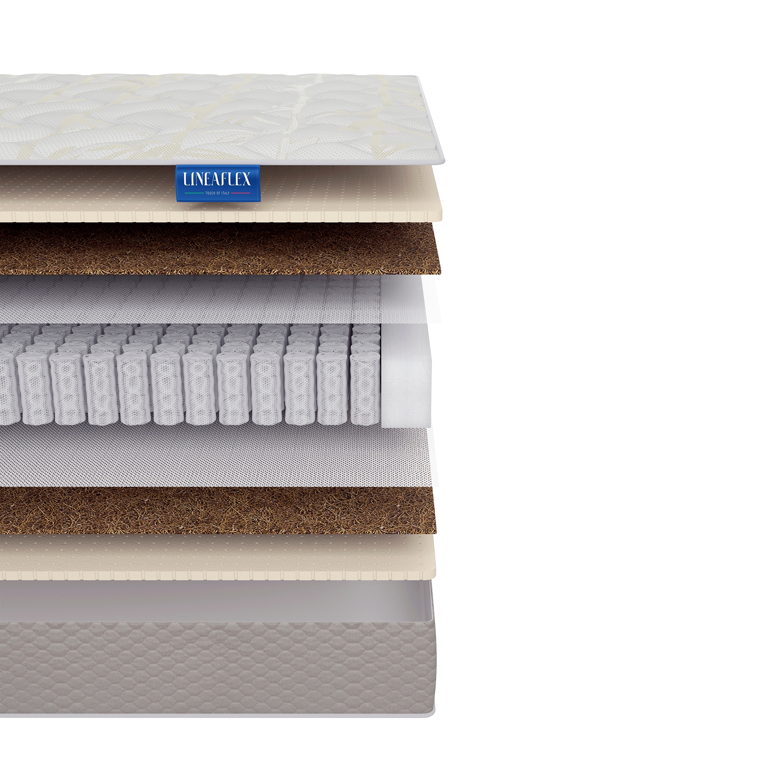 Латекс делает матрас более мягким и анатомичным. Его уникальность состоит в том, что он подстраивается под рельефы тела, тем самым обеспечивая высокий уровень комфорта. Экологичность, природная эластичность и хорошая воздухонепроницаемость плит из кокосового волокна делают поверхность матраса жёсткой и упругой. Спанбонд защищает наполнитель от пружинного блока.