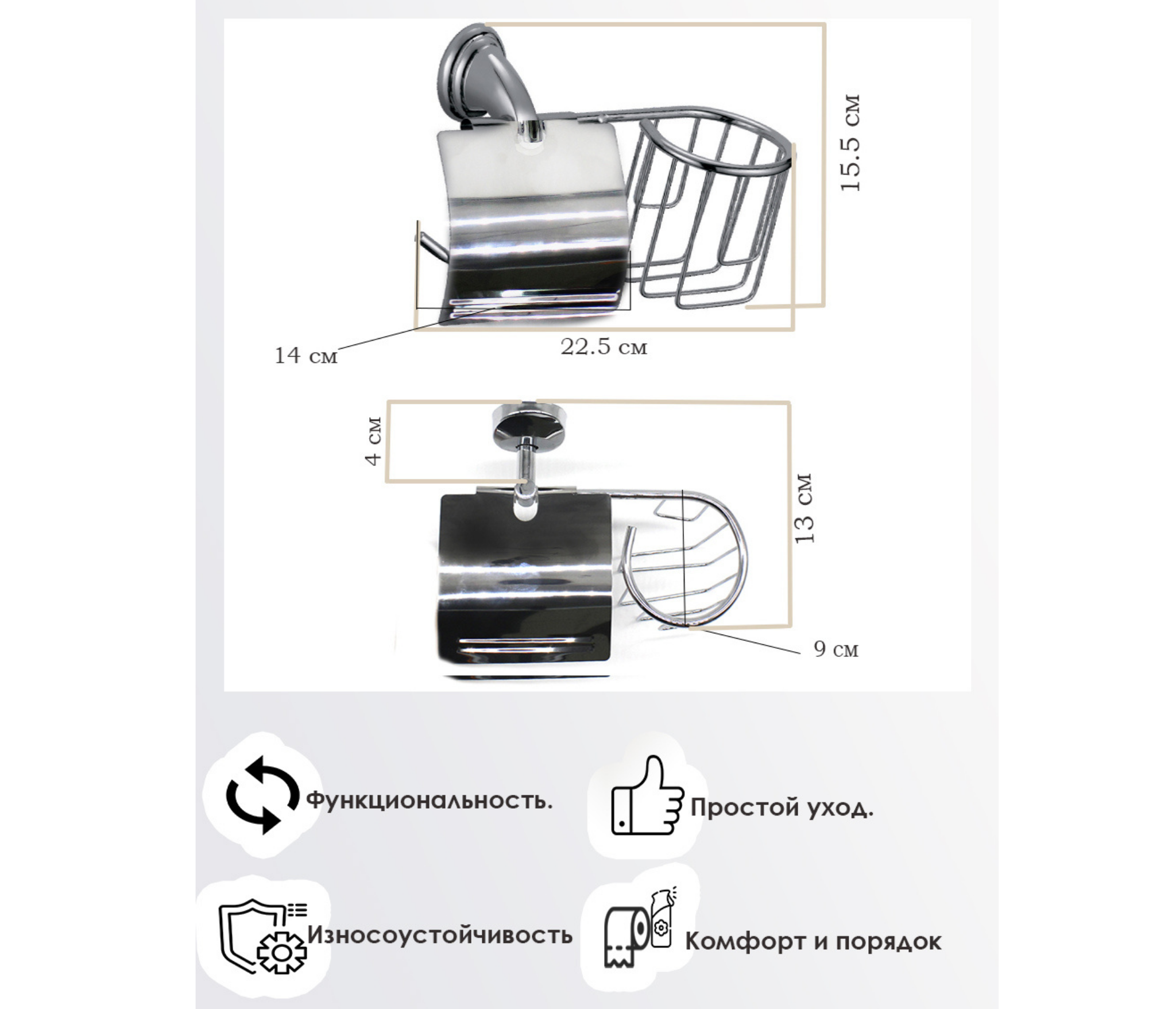 Держатель для туалетной бумаг и держатель для освежителя воздуха. Гигиеничность, экономия места и удобство использования. Изделие монтируется к стене при помощи надежного крепежа. Держатель не поддается коррозии, не деформируется и не отрывается от поверхности. Обязательный и незаменимый атрибут ванной комнаты и туалета. Благодаря универсальному серебристому корпусу держатель гармонично сочетается с любым интерьером.