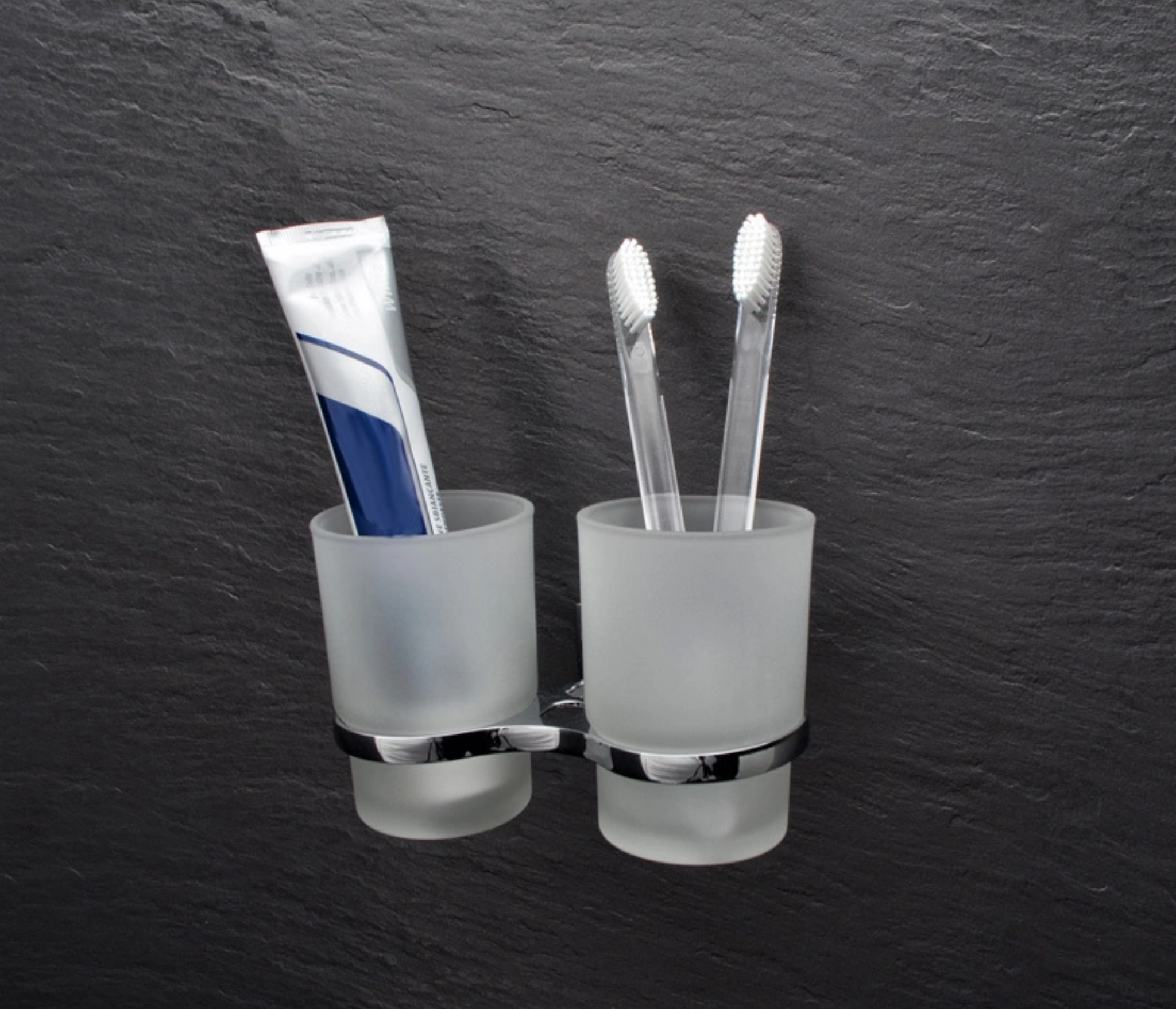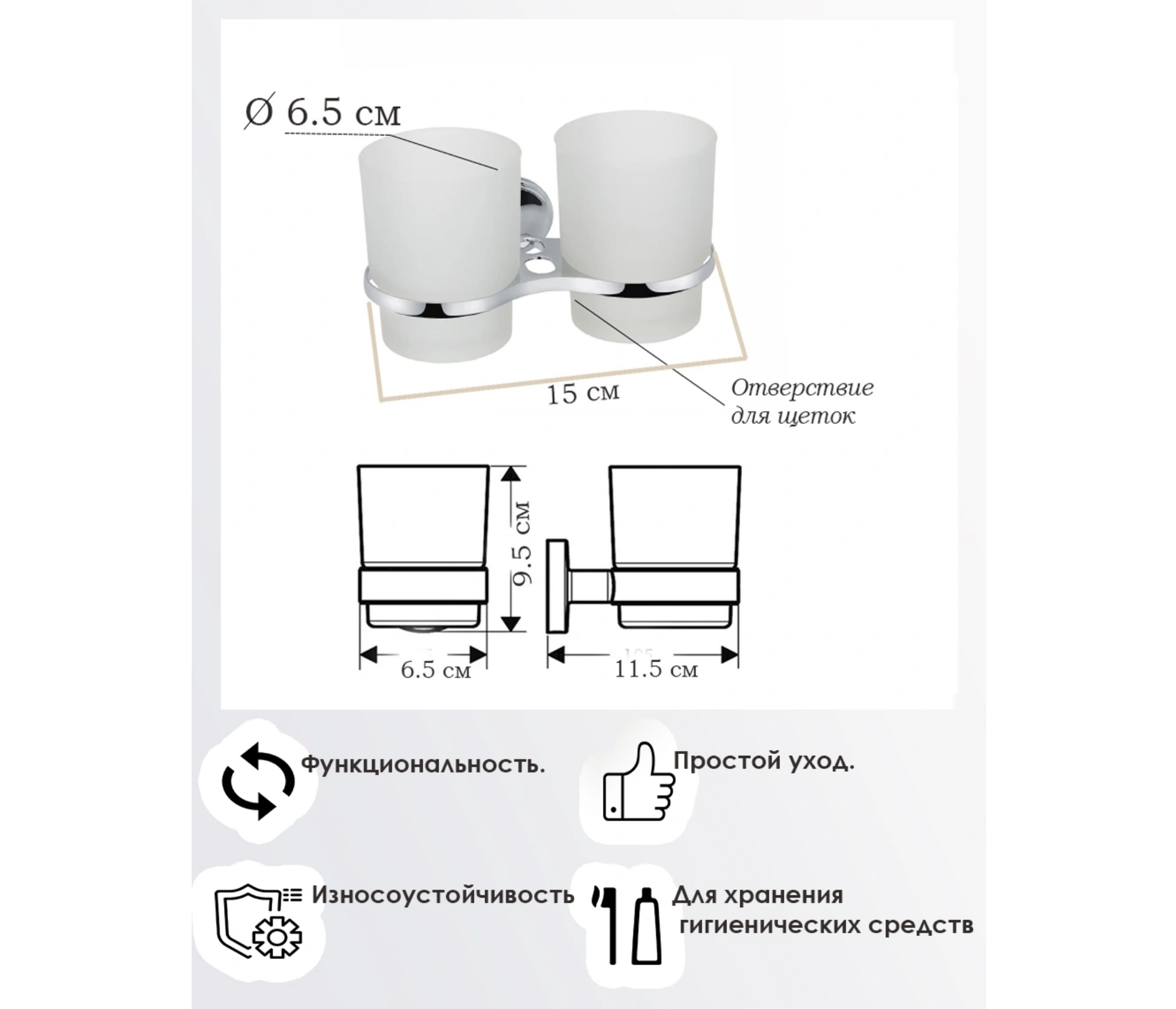Изделие монтируется к стене при помощи надежного крепежа, выполненного из металлического сплава с хромированным покрытием. Держатель не поддается коррозии, не деформируется и не отрывается от поверхности. Матовый стакан стойкий к перепадам температуры и воздействию бытовой химии. Современный эргономичный дизайн держателя отлично сочетается с любыми аксессуарами в ванной комнате.