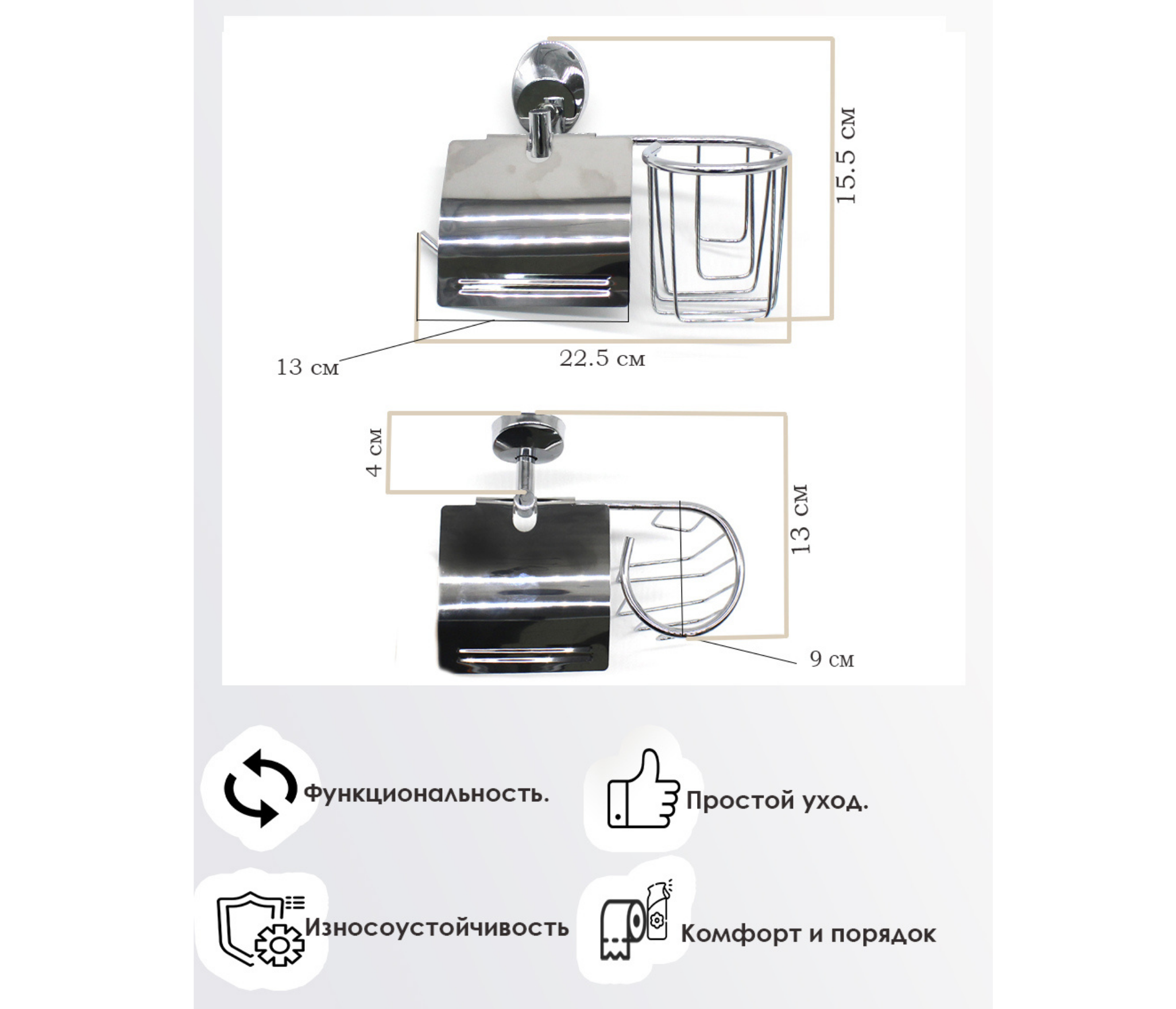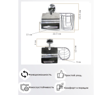 Держатель для туалетной бумаг и держатель для освежителя воздуха. Гигиеничность, экономия места и удобство использования. Изделие монтируется к стене при помощи надежного крепежа. Держатель не поддается коррозии, не деформируется и не отрывается от поверхности. Обязательный и незаменимый атрибут ванной комнаты и туалета. Благодаря универсальному серебристому корпусу держатель гармонично сочетается с любым интерьером.