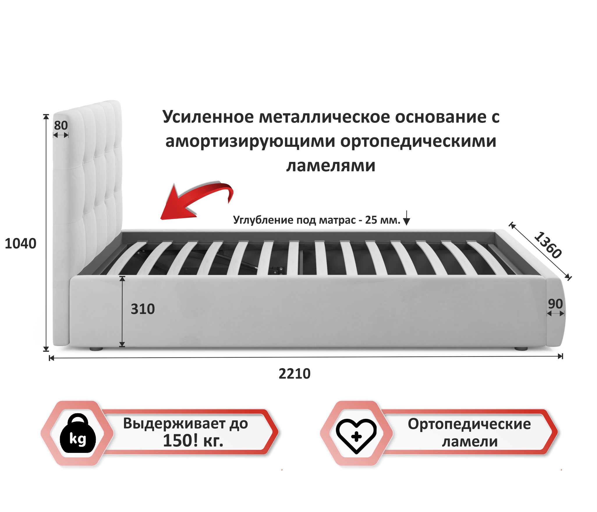 • Кровать Селеста 120х200 с мягким изголовьем имеет усиленное металлическое основание с амортизирующими ортопедическими ламелями.