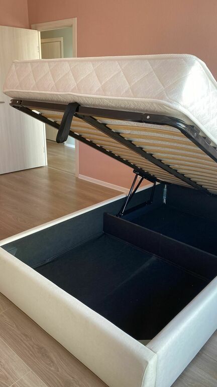 10 летняя гарантия на металлическую рамку. Газлифты повышенной мощности позволяют поднимать и опускать ортопедическую рамку с матрасом без всяких усилий. Внизу кровати предусмотрено место для хранения постельных принадлежностей. Данное пространство закрывается противопыльным матерчатым коробом- ящиком из мягкого материала - плотного спанбонда. Матерчатый короб фиксируется в подматрасном пространстве с помощью системы ленты-липучки ""HOOK&LOОP"".