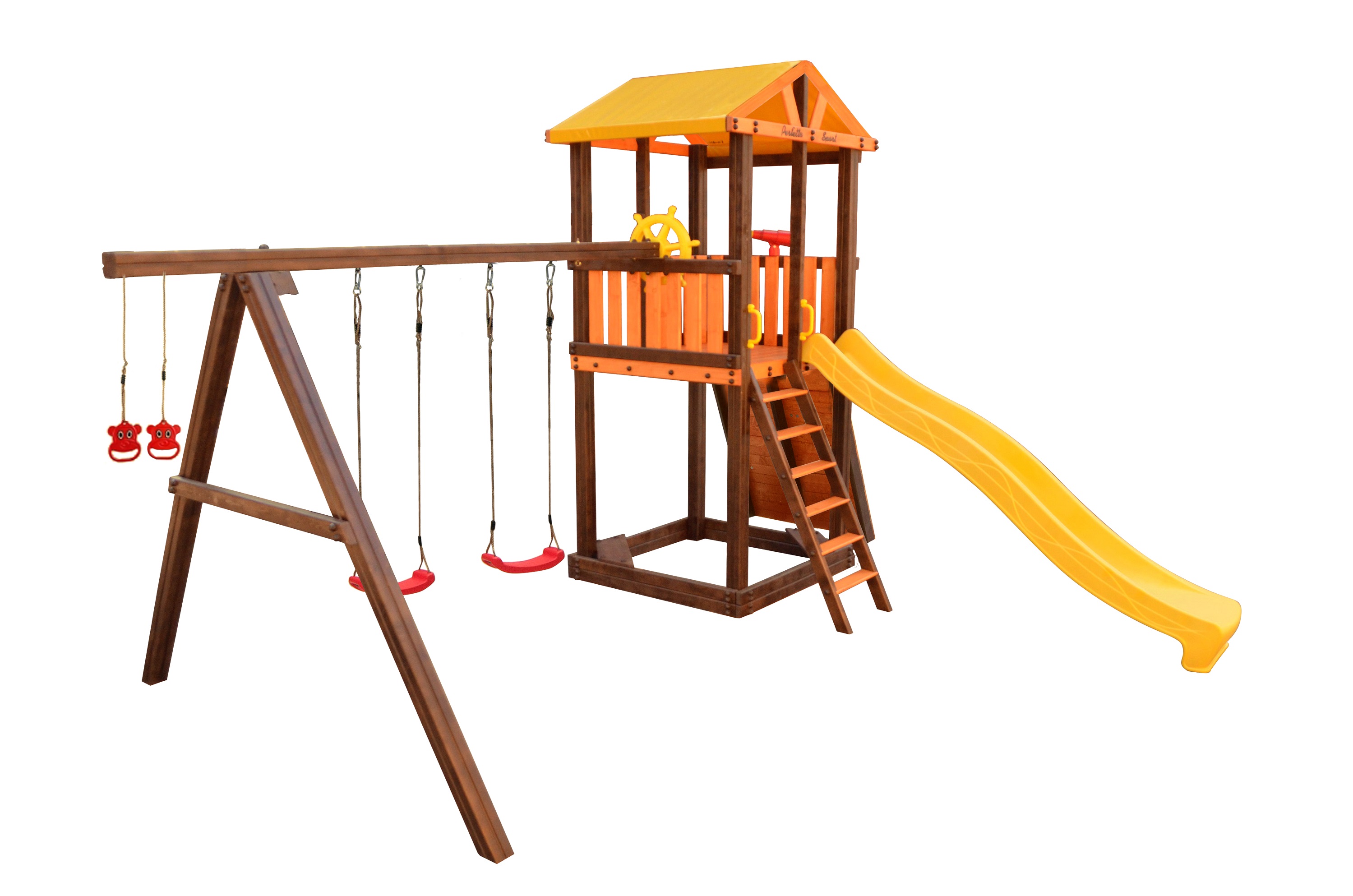 Комплектация: игровой домик, песочница, лестница, скат, ручка пластиковая - 2 шт, А-опция, качели ""Лодочка"" 2 шт, кольца ""Микки"", штурвал ""Шторм"", бинокль ""Капитан"", скалодром большой