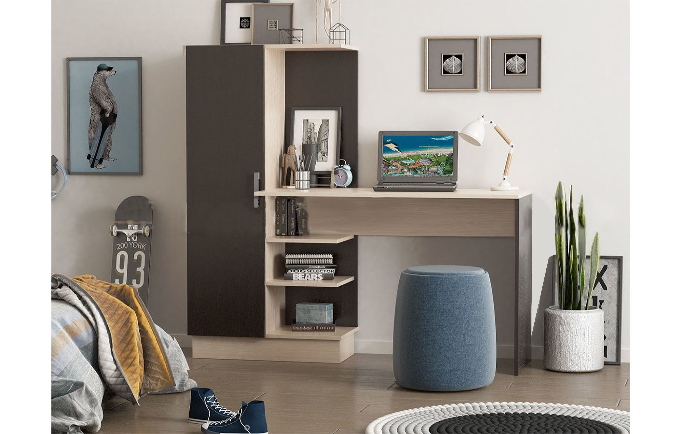 Компьютерный стол №1 — полноценный домашний офис, включающий стол, под столешницей расположены 3 открытые полки, шкаф-пенал с 1 дверью. Стол выполнен из ЛДСП в контрастных цветах.
