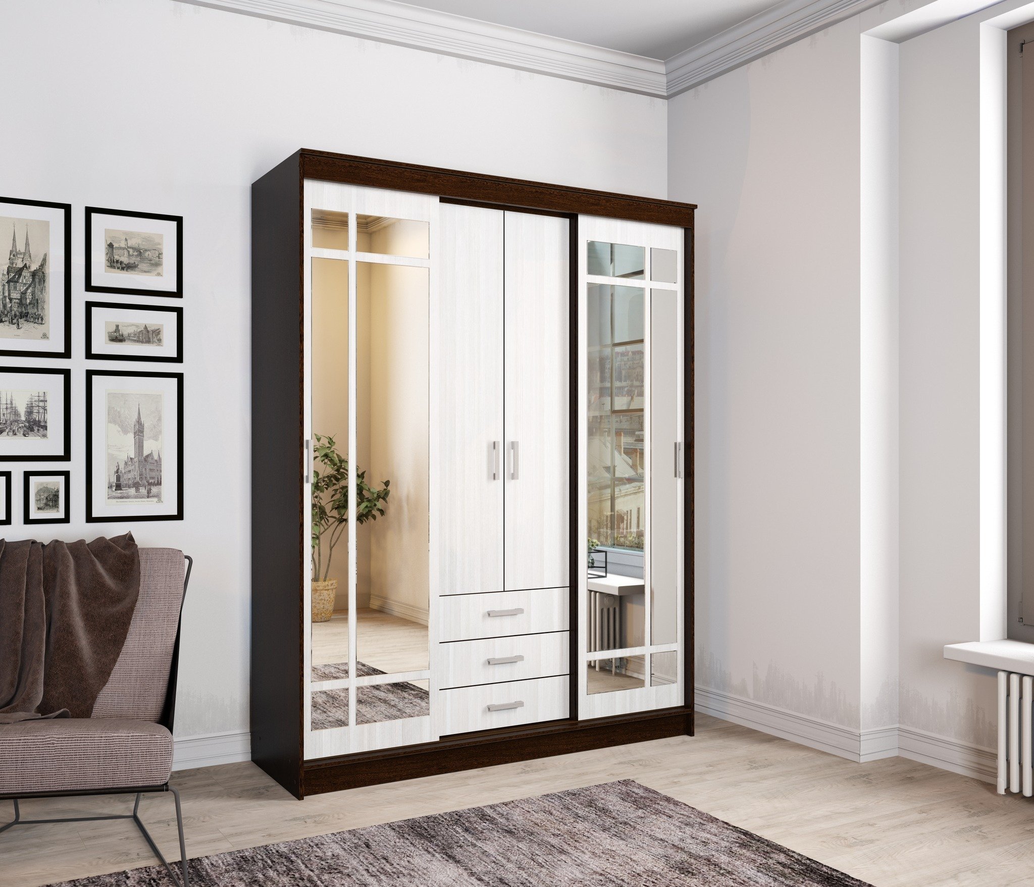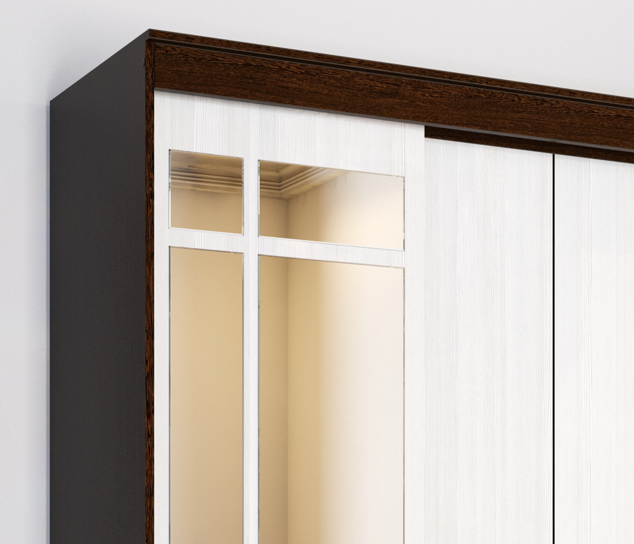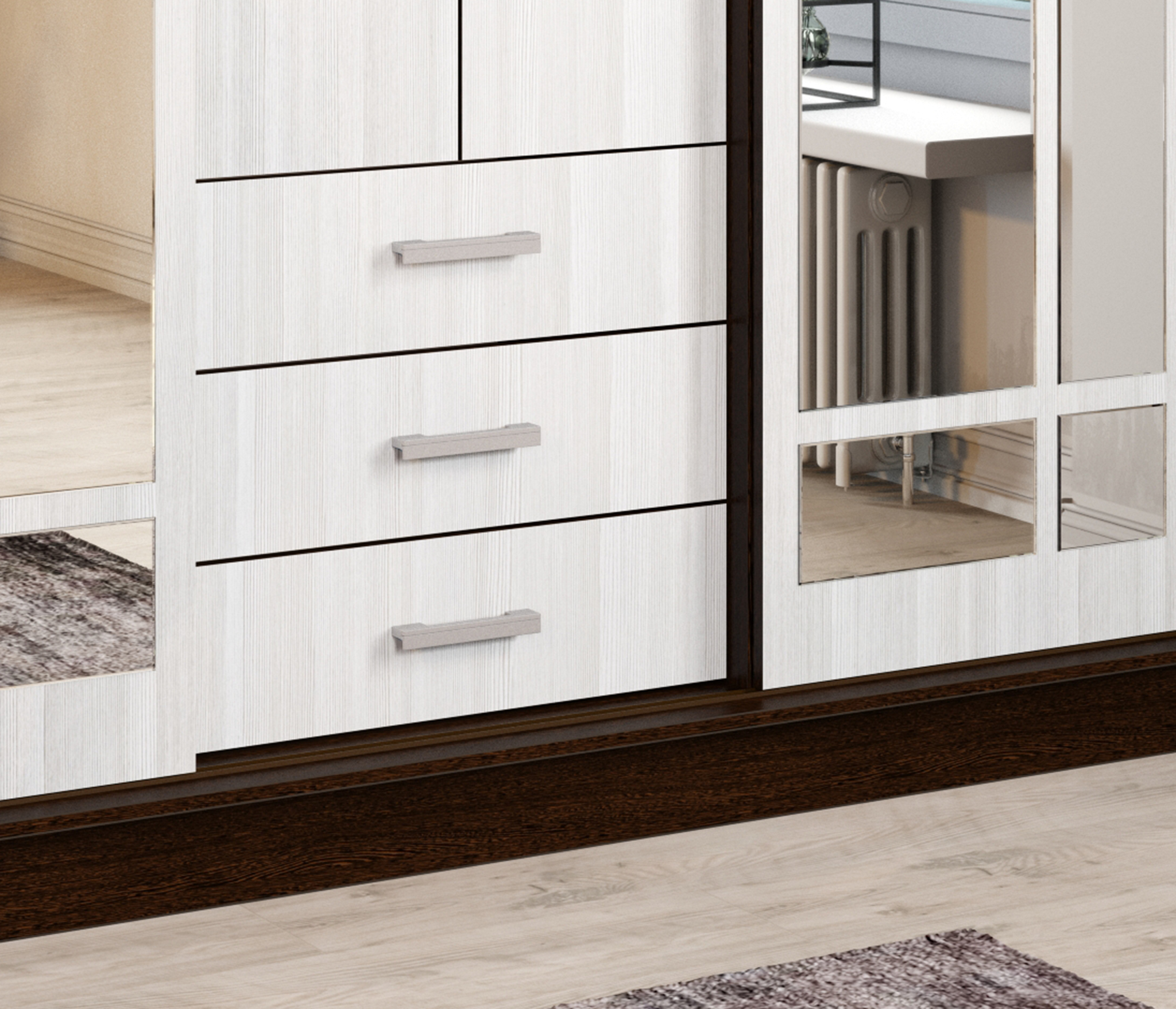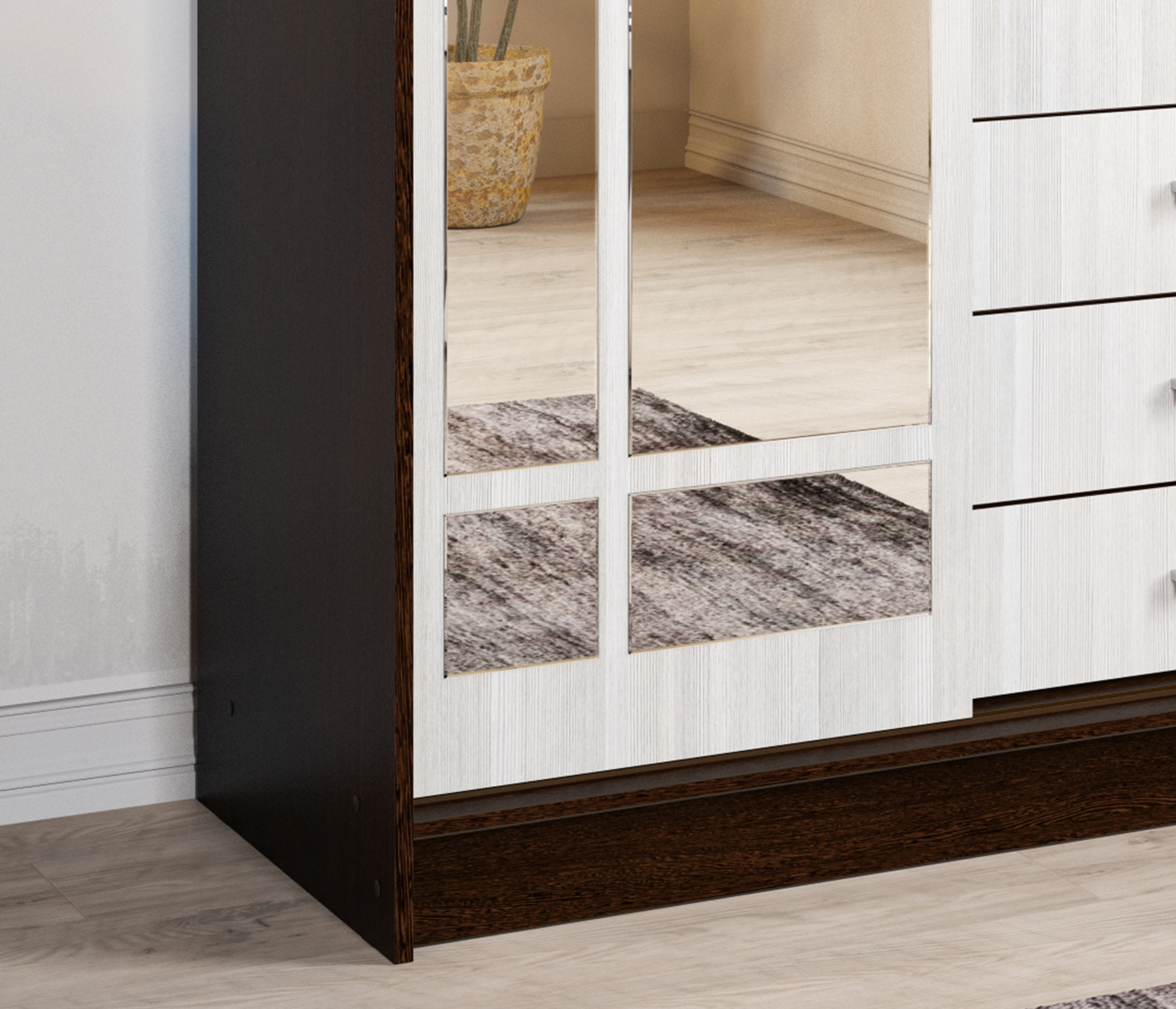 Содержит отдел с антресольной полкой и штангой для вешалок, отдел с полками, два выдвижных ящика и отдел с двумя штангами для вешалок. Зеркала входят в комплект. Материал ЛДСП, кромка ПВХ, зеркало