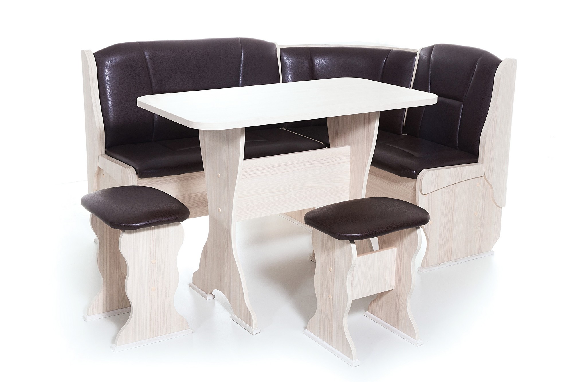 Набор мебели для кухни включающий в себя угловую скамью, стол и два табурета.