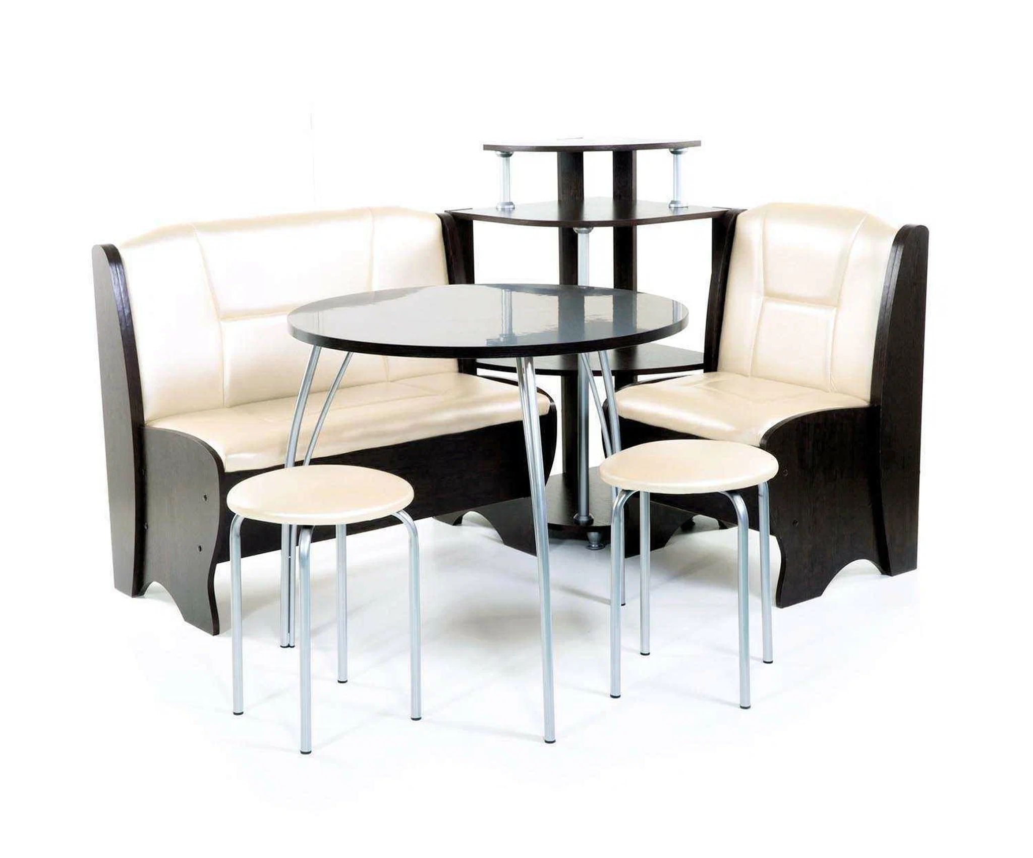 Набор мебели для кухни включающий в себя большую прямую скамью,малую прямую скамью,угловую этажерку, стол на металлических ногах и два табурета на металлокаркасе .