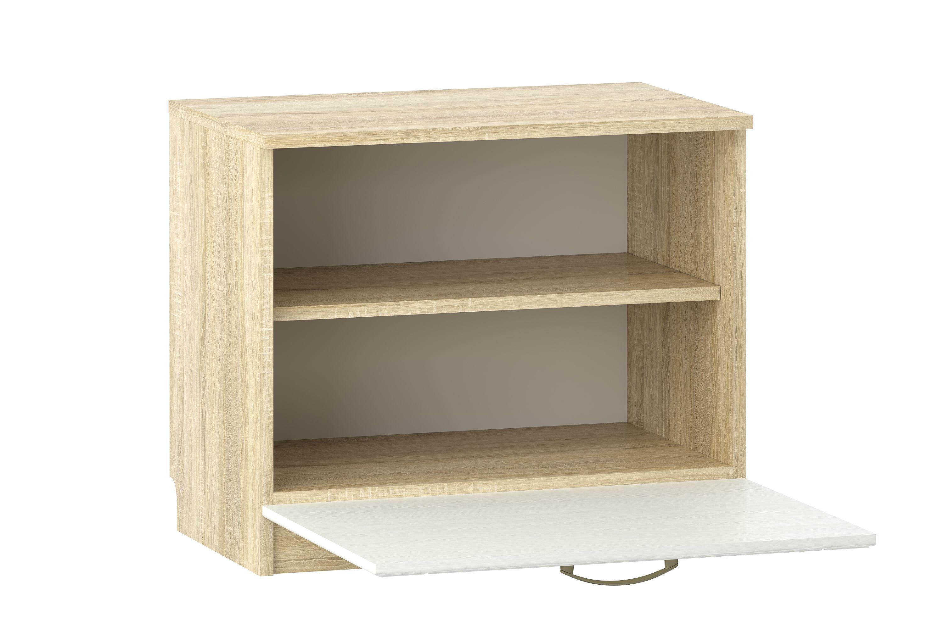 Тумба оснащена секцией с двумя полками для обуви и глухой откидной дверцей.