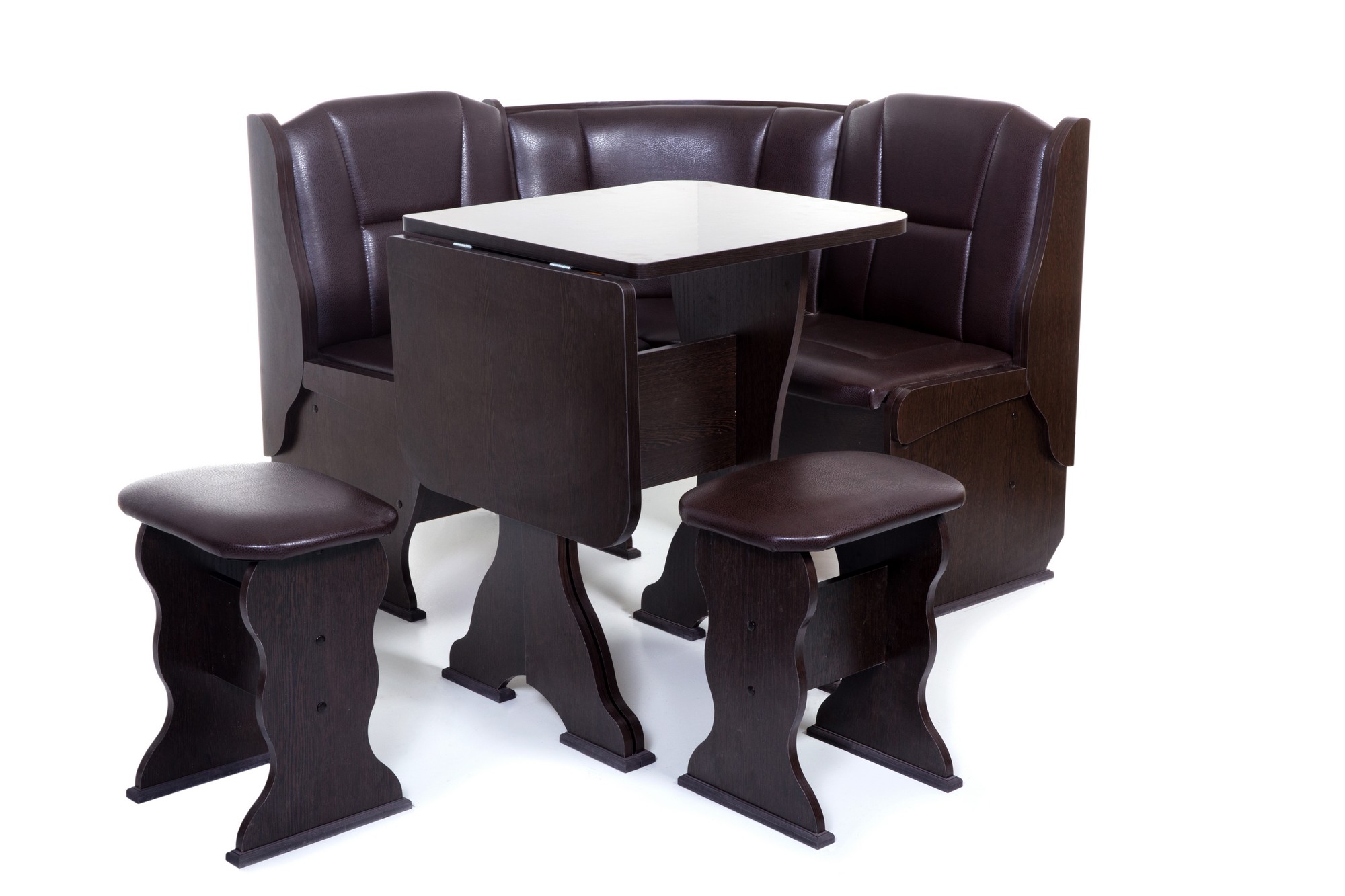 Набор мебели для кухни включающий в себя угловую скамью, стол и два табурета.