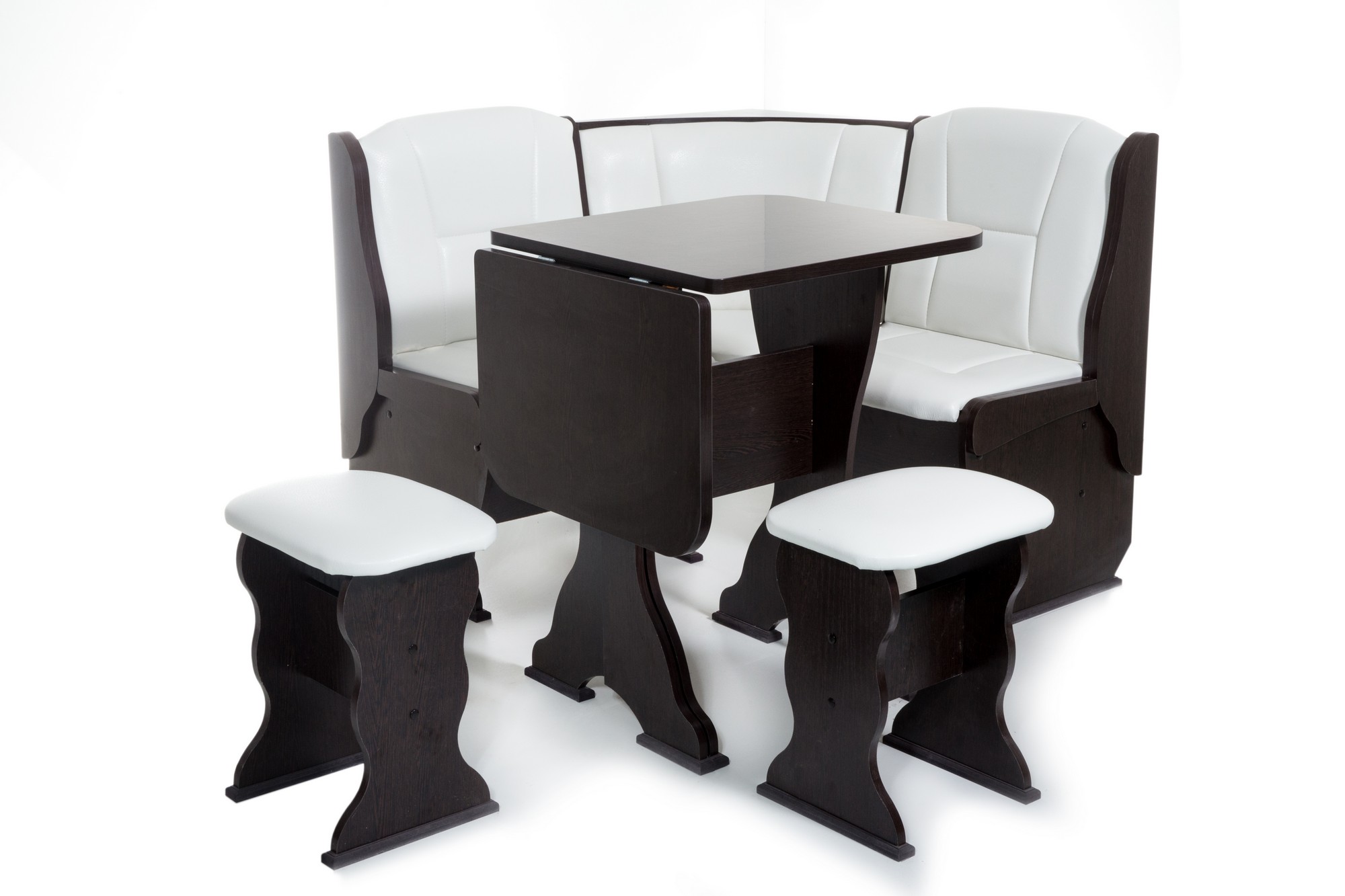 Набор мебели для кухни включающий в себя угловую скамью, стол и два табурета.