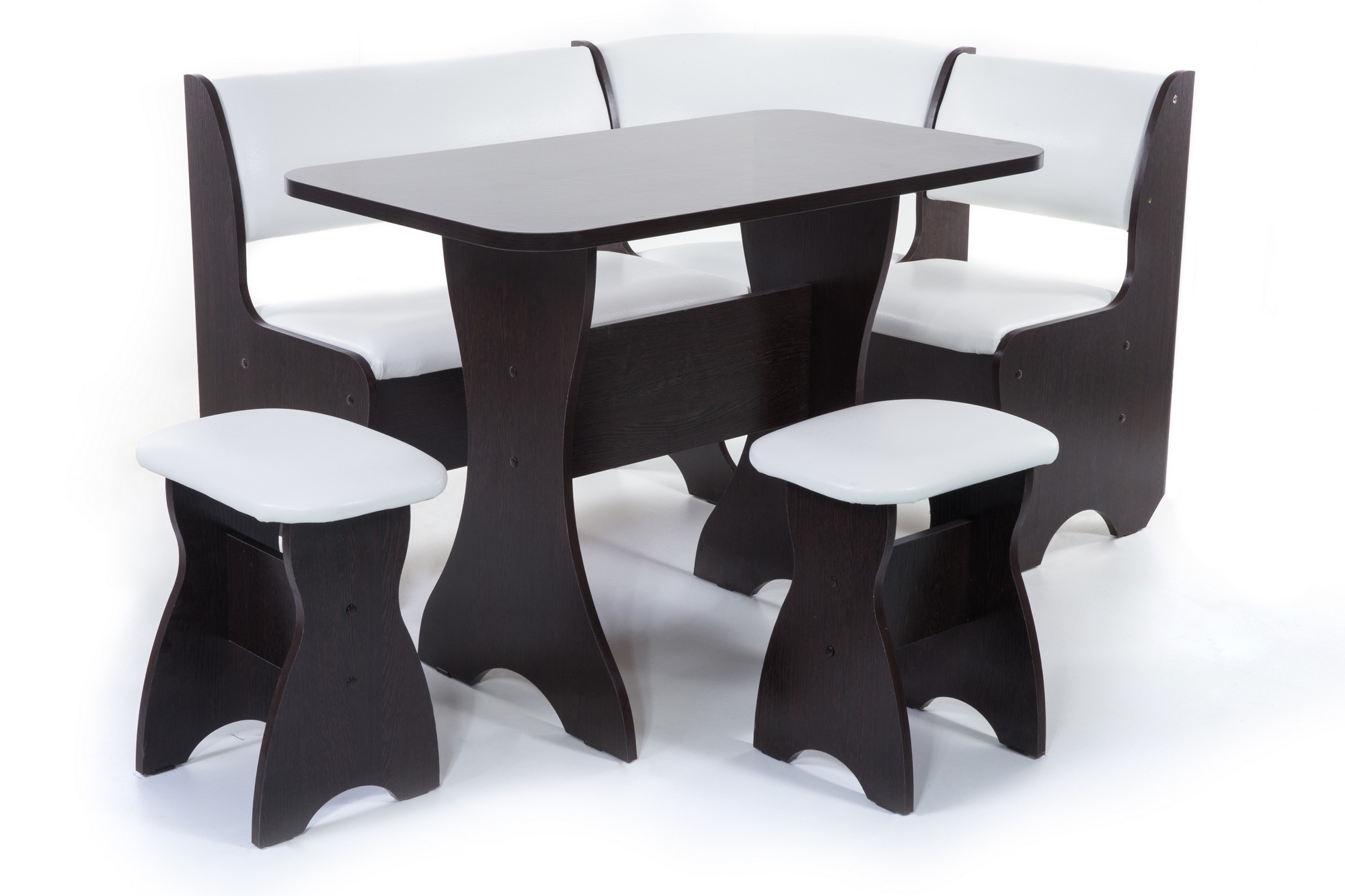 Набор мебели для кухни включающий в себя угловую скамью, стол и два табурета.