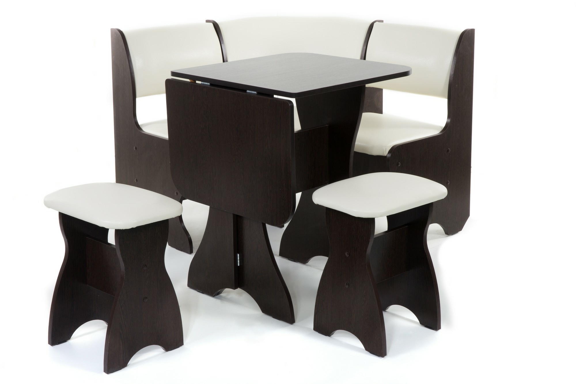 Набор мебели для кухни включающий в себя угловую скамью, стол и два табурета.