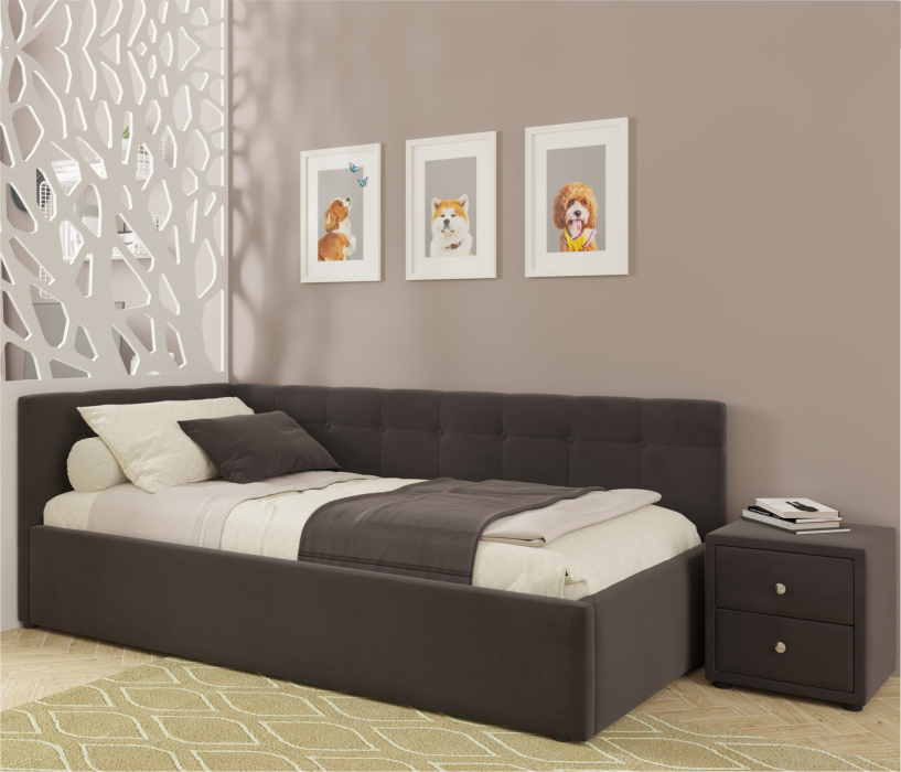 Односпальная угловая кровать-тахта Bonna с подъемным механизмом – уникальный предмет мебели, который совмещает в себе полноценную кровать и диван. Тахта с двумя мягкими спинками выполнена из модной мебельной ткани – велюр. Это уникальный материал, который получается за счет сплетения пяти волокон одновременно. Дорогая ткань велюр придает кровати более величественный благородный вид. Ткань износостойкая, легко чиститься от загрязнений (влажной тряпочкой, любыми средствами, кроме средств с растворителями), практичная, эластичная, устойчивая к ультрафиолету. Рельефные спинки с неглубокими стяжками украшены декоративными пуговицами в тон обивки. Мягкие изголовья придают не только особую изысканность кровати, но и позволяют использовать кровать-тахту как мягкий диван для отдыха.