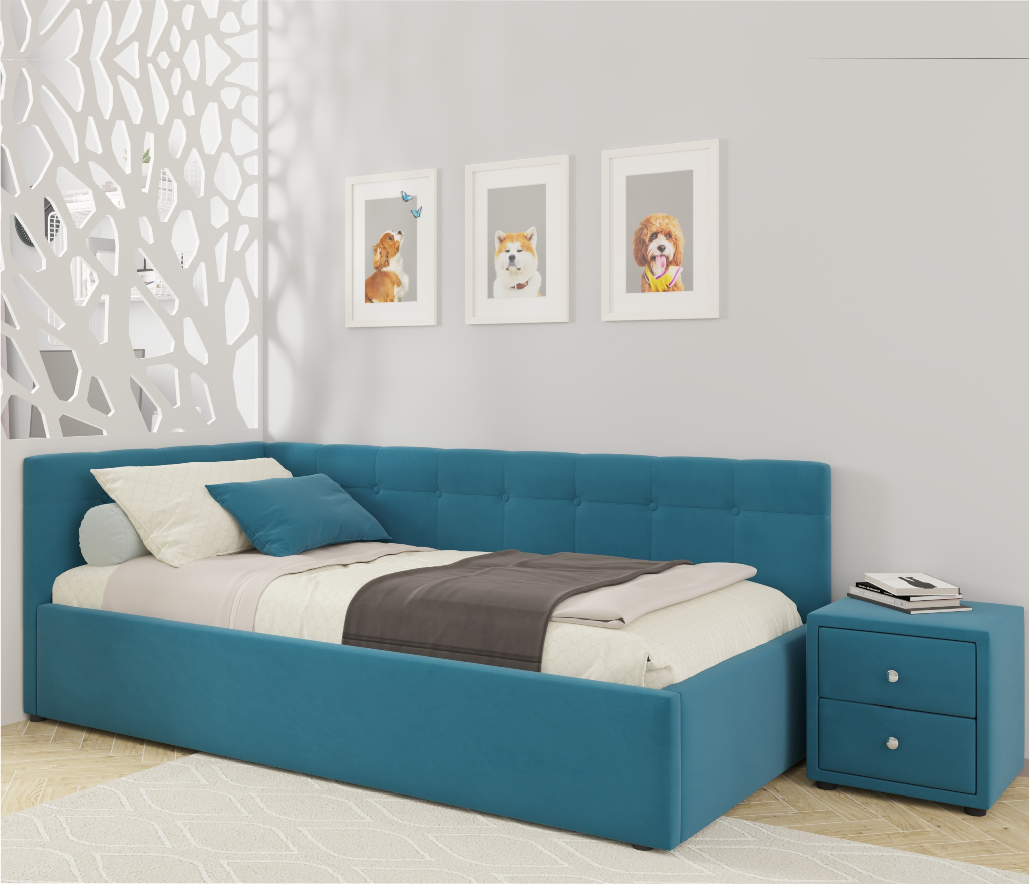 Односпальная угловая кровать-тахта Bonna с подъемным механизмом – уникальный предмет мебели, который совмещает в себе полноценную кровать и диван. Тахта с двумя мягкими спинками выполнена из модной мебельной ткани – велюр. Это уникальный материал, который получается за счет сплетения пяти волокон одновременно. Дорогая ткань велюр придает кровати более величественный благородный вид. Ткань износостойкая, легко чиститься от загрязнений (влажной тряпочкой, любыми средствами, кроме средств с растворителями), практичная, эластичная, устойчивая к ультрафиолету. Рельефные спинки с неглубокими стяжками украшены декоративными пуговицами в тон обивки. Мягкие изголовья придают не только особую изысканность кровати, но и позволяют использовать кровать-тахту как мягкий диван для отдыха.