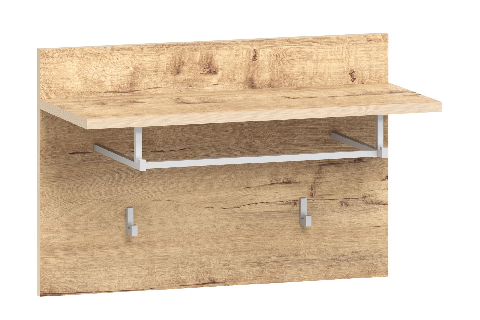 Небольшая навесная вешалка для прихожей с двумя крючками и шляпной полкой.
