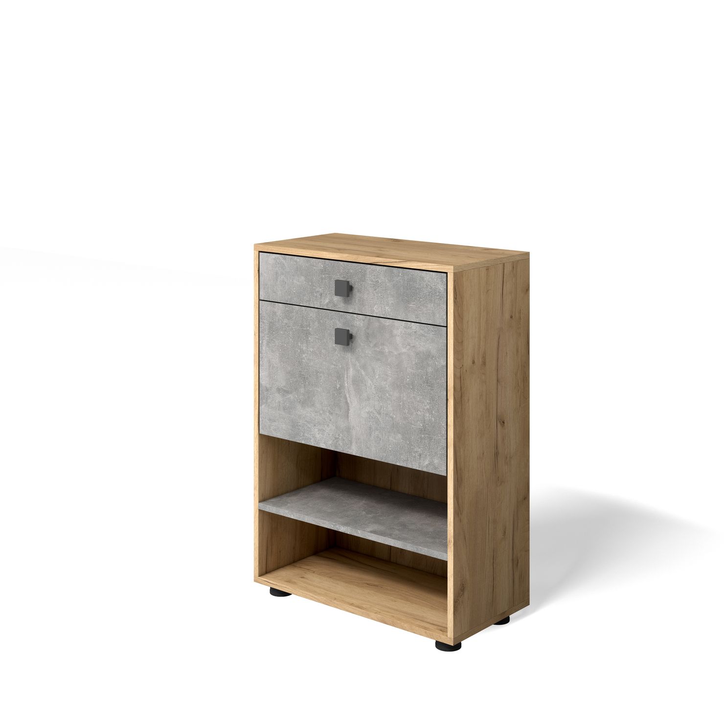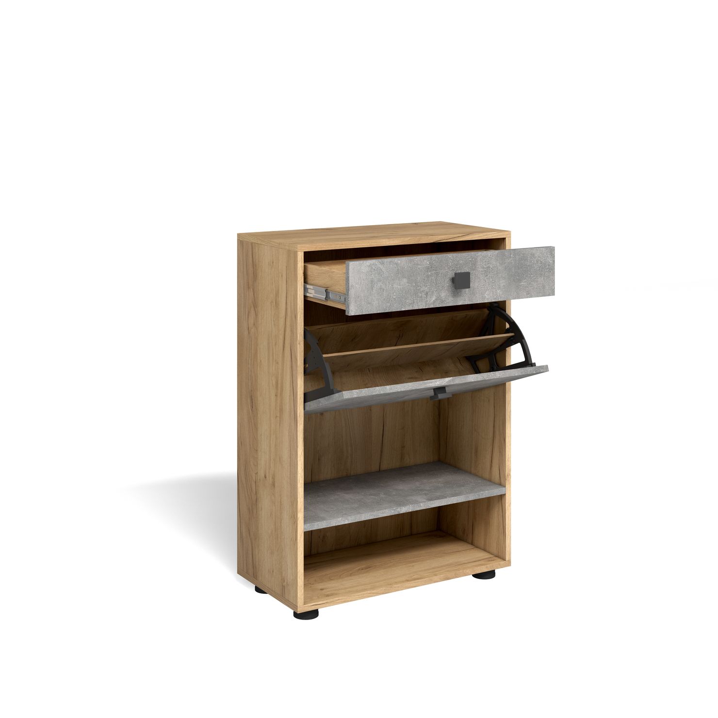 Обувница имеет ящик для мелочей, обувницу с откидной дверцей и две открытые полки для обуви.